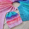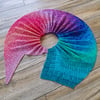 Die Farben werden in der gleichen Reihenfolge 1-18 wie beim Schal verstrickt. Man beginnt mit Farbe F1 beim Maschenanschlag und endet oben mit F18. Von jeder Farbe F1-F17 werden jeweils 5 Runden gestrickt. Die letzten Runden mit F18. Aufgrund der geringeren Rundenanzahl werden die Farben nacheinander verstrickt; es gibt also keine Übergangsrunden, in denen Farben abwechselnd verwendet werden.