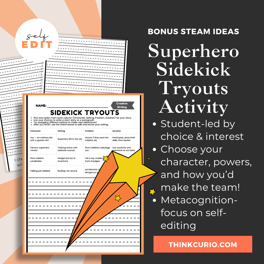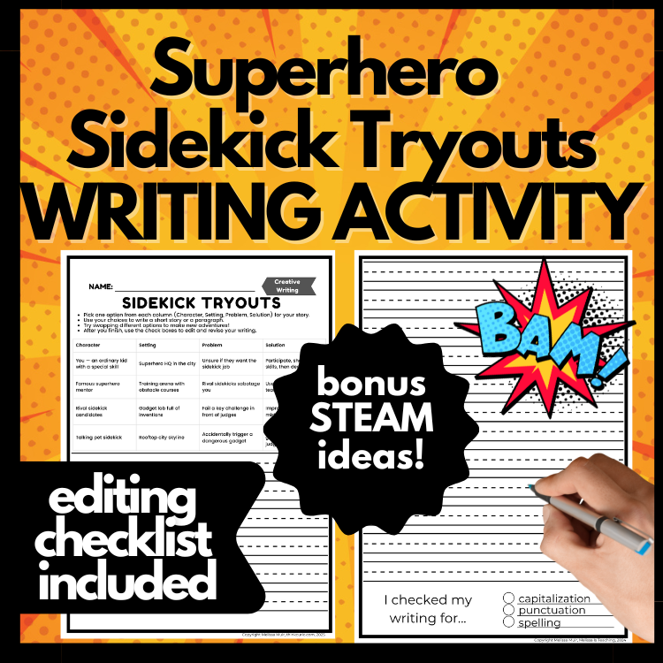 Engage your students withĀ Sidekick Tryouts, a superhero-themed creative writing activity that encourages 2ndā5th graders toĀ build unique stories using characters, settings, problems, and solutions. Students can mix and match heroes, rivals, mentors, and talking pets with fun settings like superhero HQs, obstacle courses, and gadget labs.