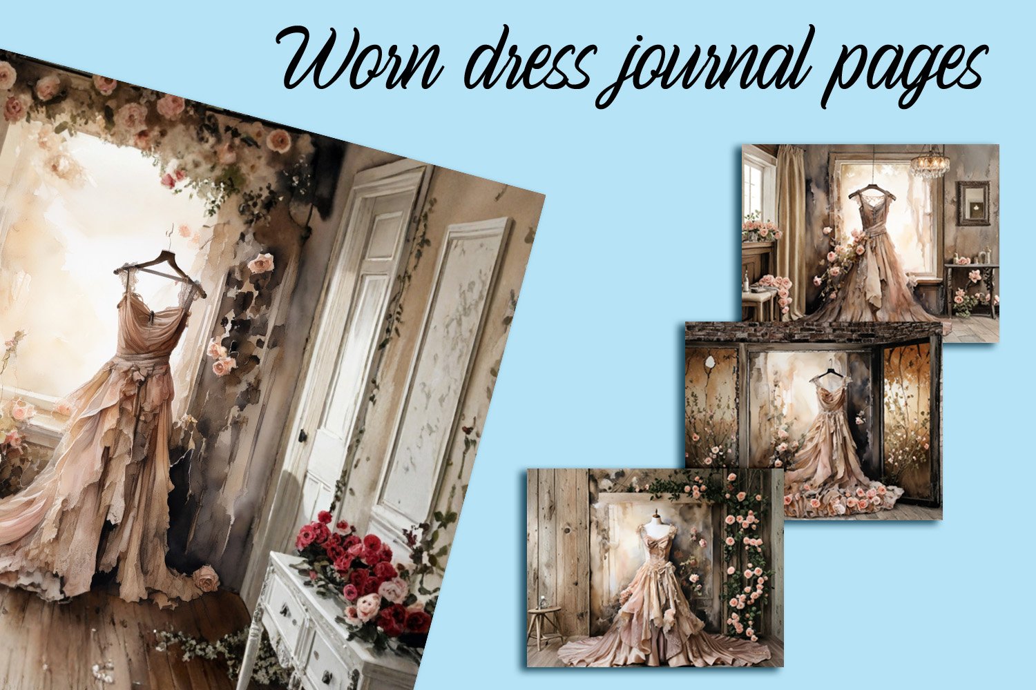 Bring a soft, romantic vintage touch to your creative projects with the Worn Dress Journal Pages — a set of 12 high-quality JPG papers featuring delicate dresses surrounded by flowers and aged textures. Each page captures that perfect balance of feminine charm and timeworn mystery.