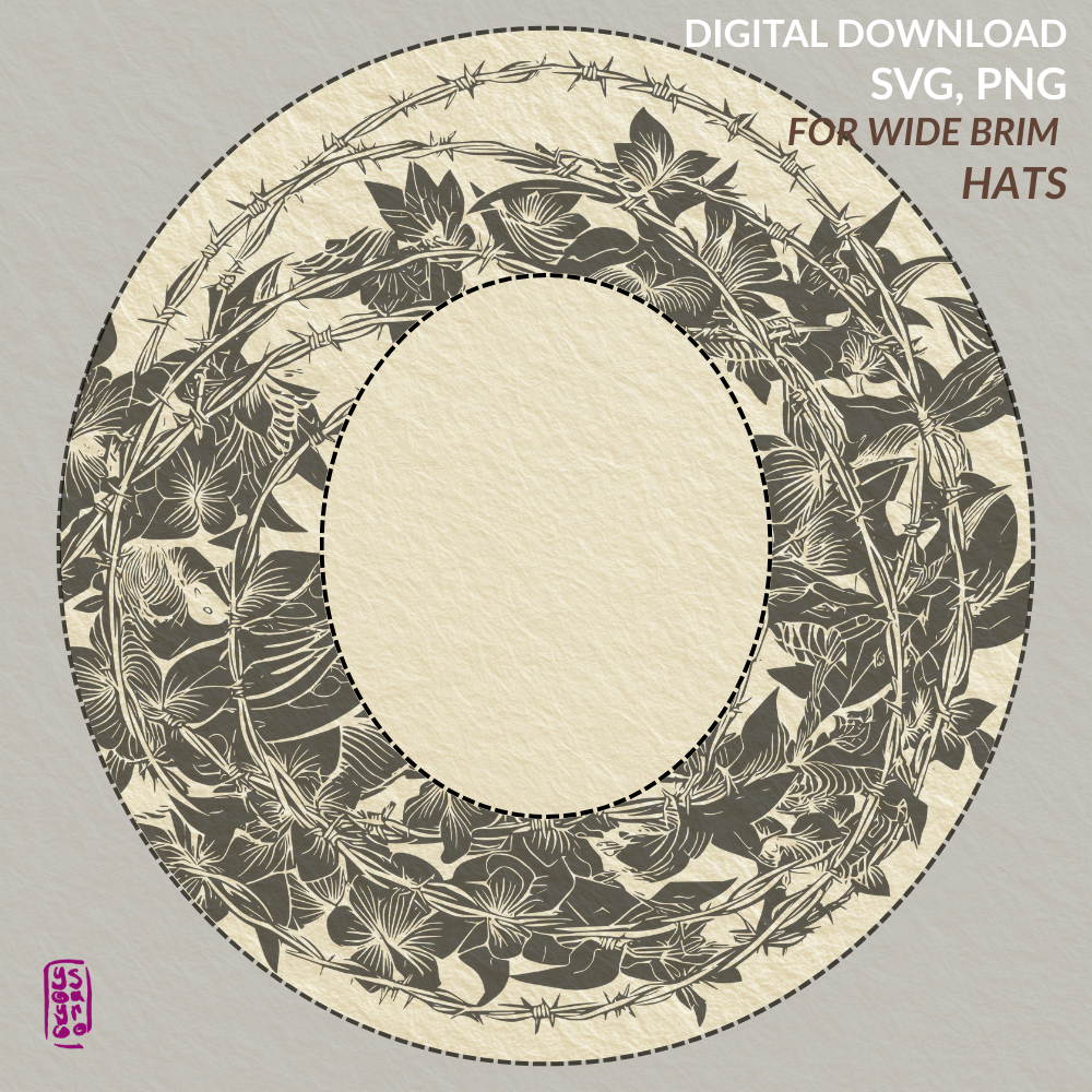 Tags: Barbed Wire SVG, Floral Wreath SVG, Western Hat Design, Rose Engraving File, Cowboy Floral, Laser Engraving File, Hat Engraving SVG, Wide Brim Hat Art, Rustic Design, Wood Burning SVG, Leather Burning, Digital Download, SVG Cut File