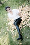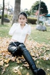 Warm spring is here, and Abby puts on tight black leather pants and a white short-sleeved shirt and takes a walk in the antique garden.