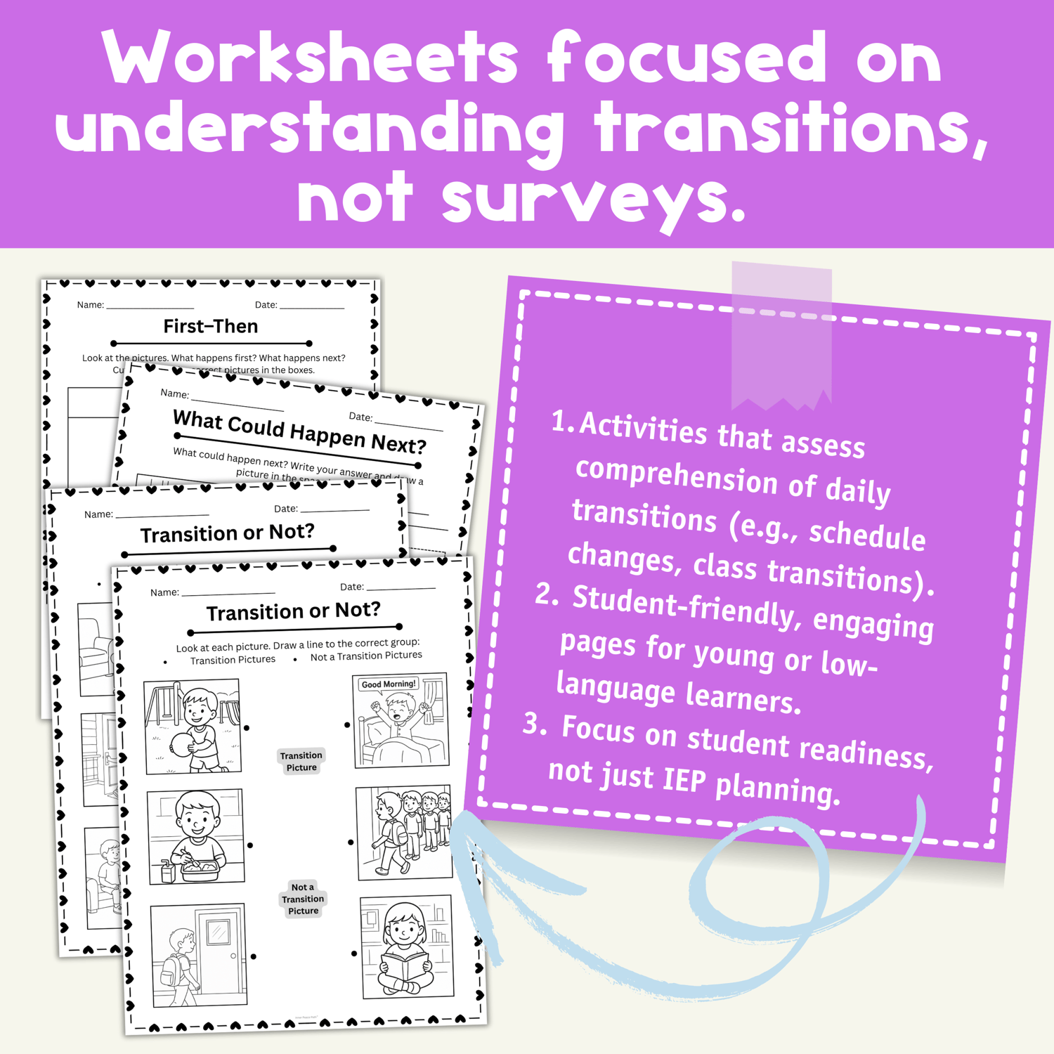 This resource offers true worksheet activities that focus on recognizing daily transitions — not surveys or checklists. Students will practice real-life transitions like schedule changes and class routines through simple, visual tasks.