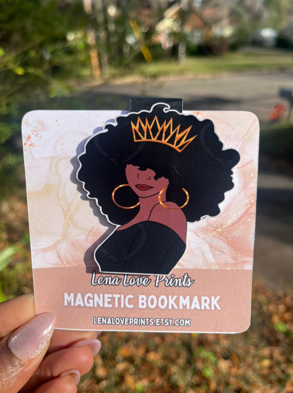 This magnetic bookmark features a confident, crowned Afro queen illustration that celebrates Black beauty, femininity, and quiet power. Designed to clip securely onto your page, it keeps your place without bending or damaging your book.
