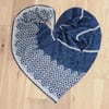 This shawl is an asymmetric triangle knitted sideways from a few cast on stitches finishing with a broad mosaic (slipped stitch) border. There are a couple of options for this shawl. It can be knitted almost entirely in stockinette stitch for a smooth shawl and defined mosaic or for those who hate to purl there is a garter stitch version that gives a more textured feel. The front cover photo shows the shawl in stockinette.