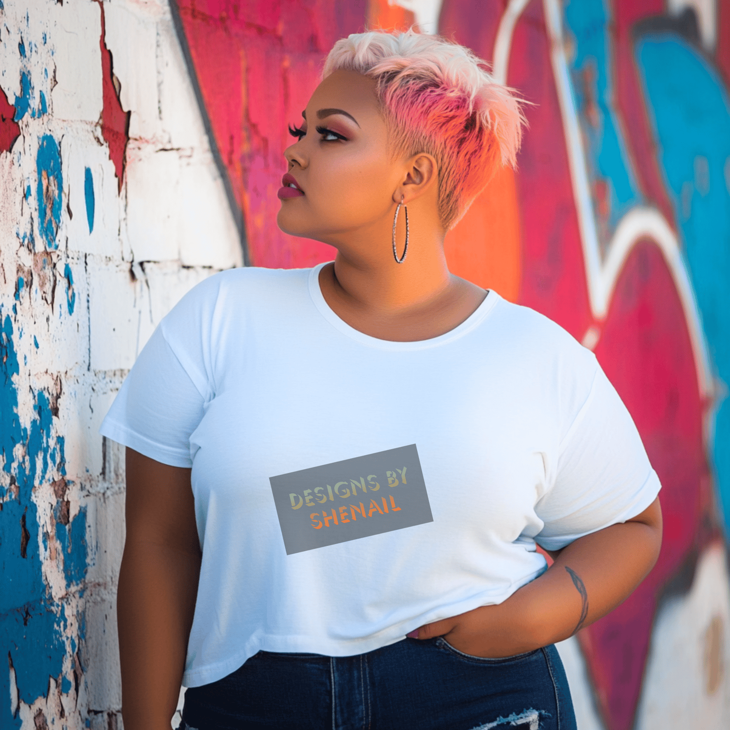Make your design shine with this bold, eye-catching white t-shirt mockup featuring a confident plus-size Black model with short pink ombré hair and hoop earrings, standing against a vibrant graffiti wall. This mockup is perfect for showcasing your uplifting, street-style, or faith-based designs with bold personality.