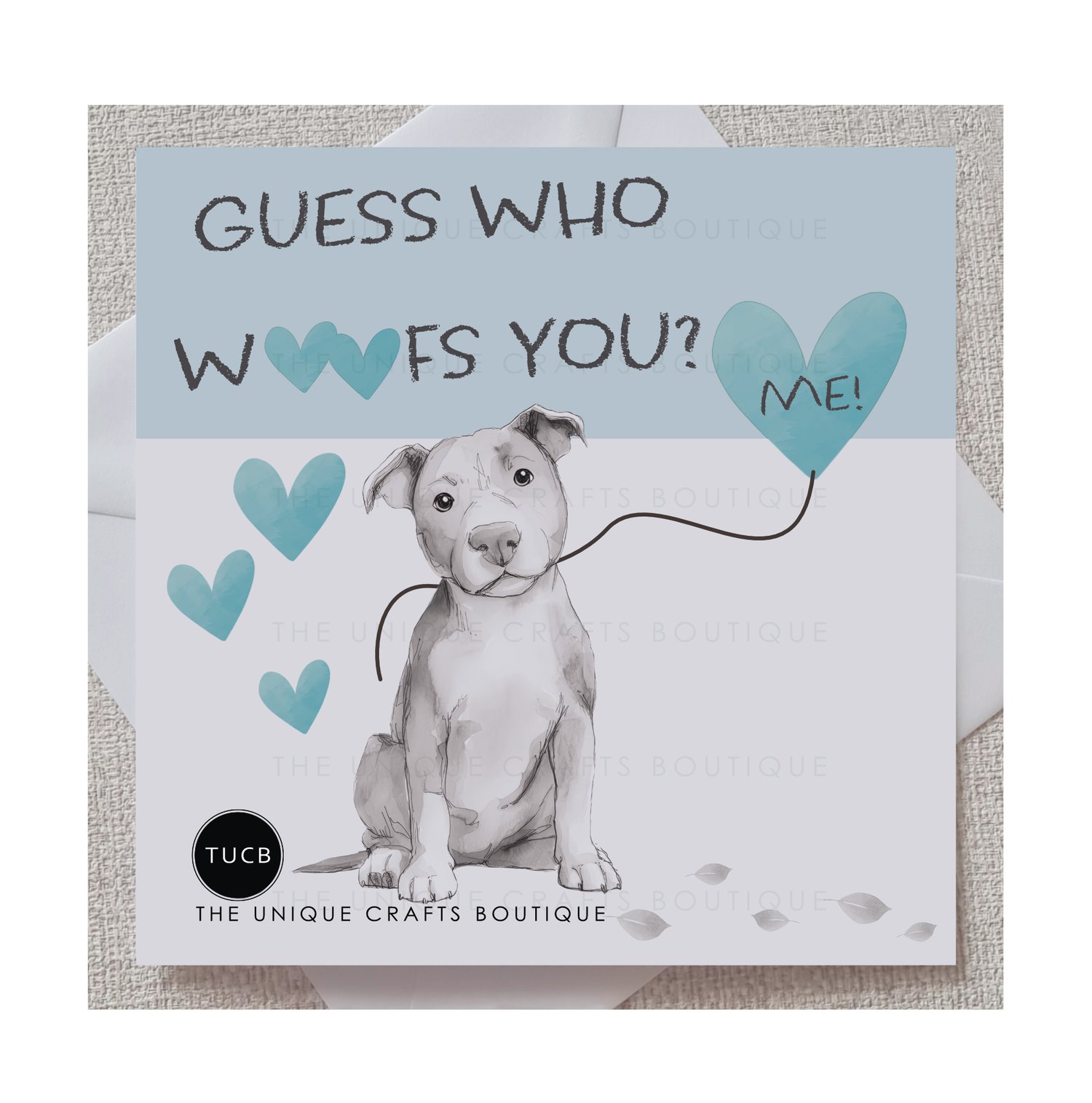 This card is perfect from your fur baby to show how much you love them this Valentine's Day. Printed with a cute sketched dog holding a heart balloon and the message 'guess who woofs you? Me!'