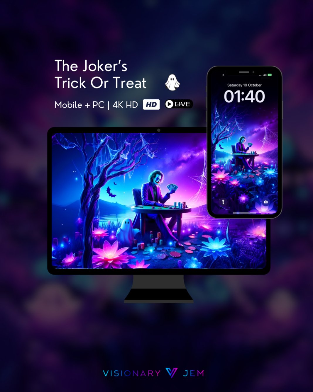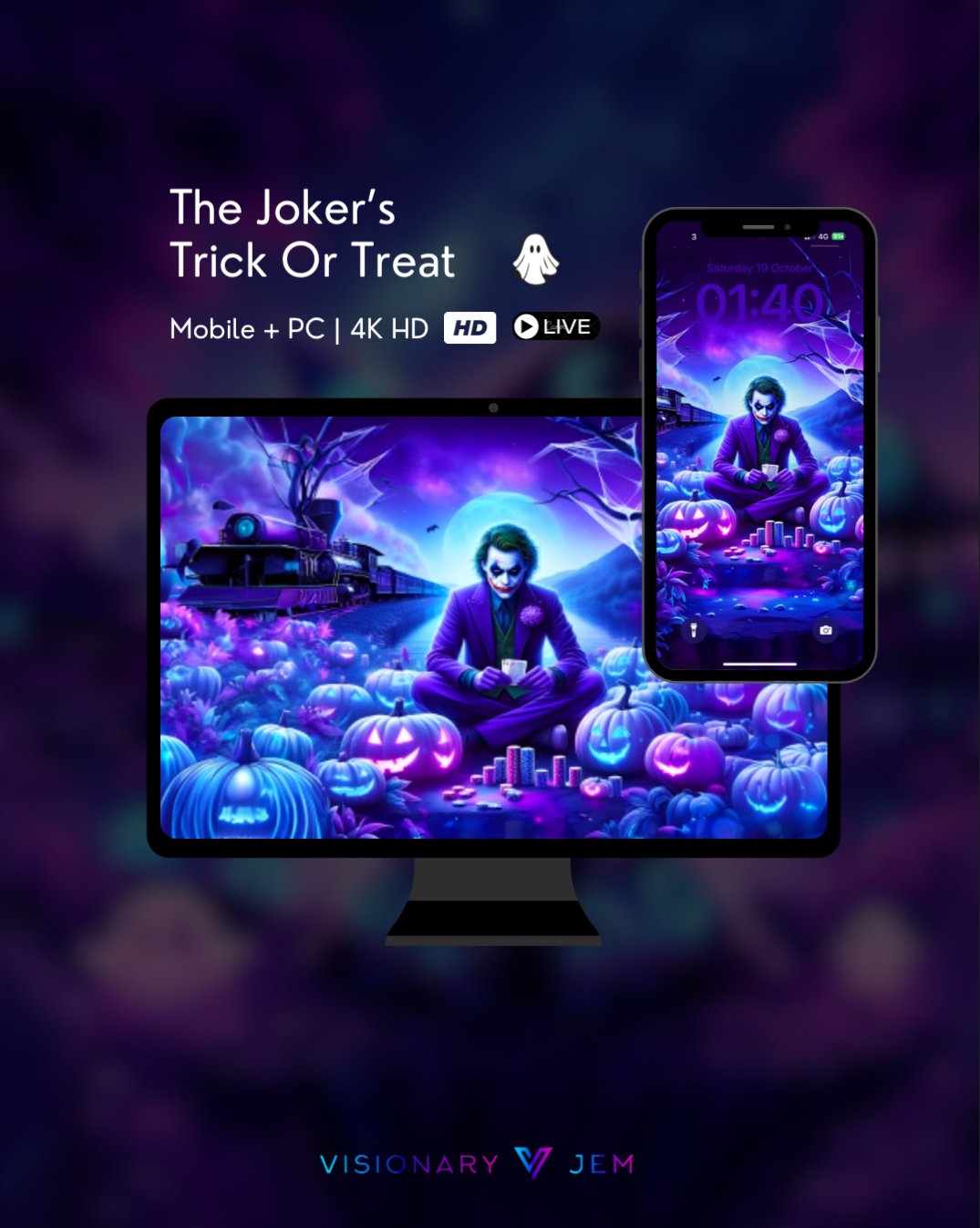 Transform your Screens with The Joker’s Trick Or Treat | Halloween Edition Wallpaper pack, ideal for gamers, streamers, and digital art enthusiasts.