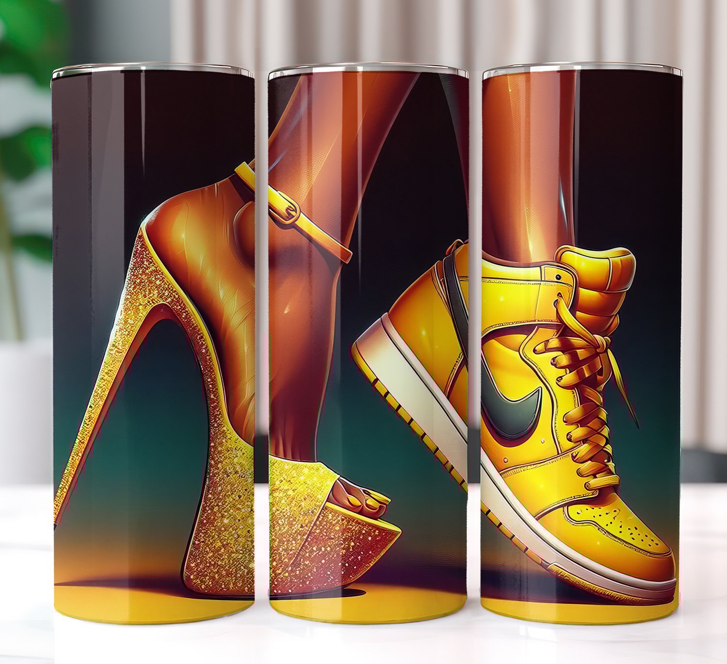 This bold and glamorous tumbler design features a sparkling gold glitter stiletto on one side and a hot gold sneaker on the other—perfect for the fashion-forward babe who rocks every step.