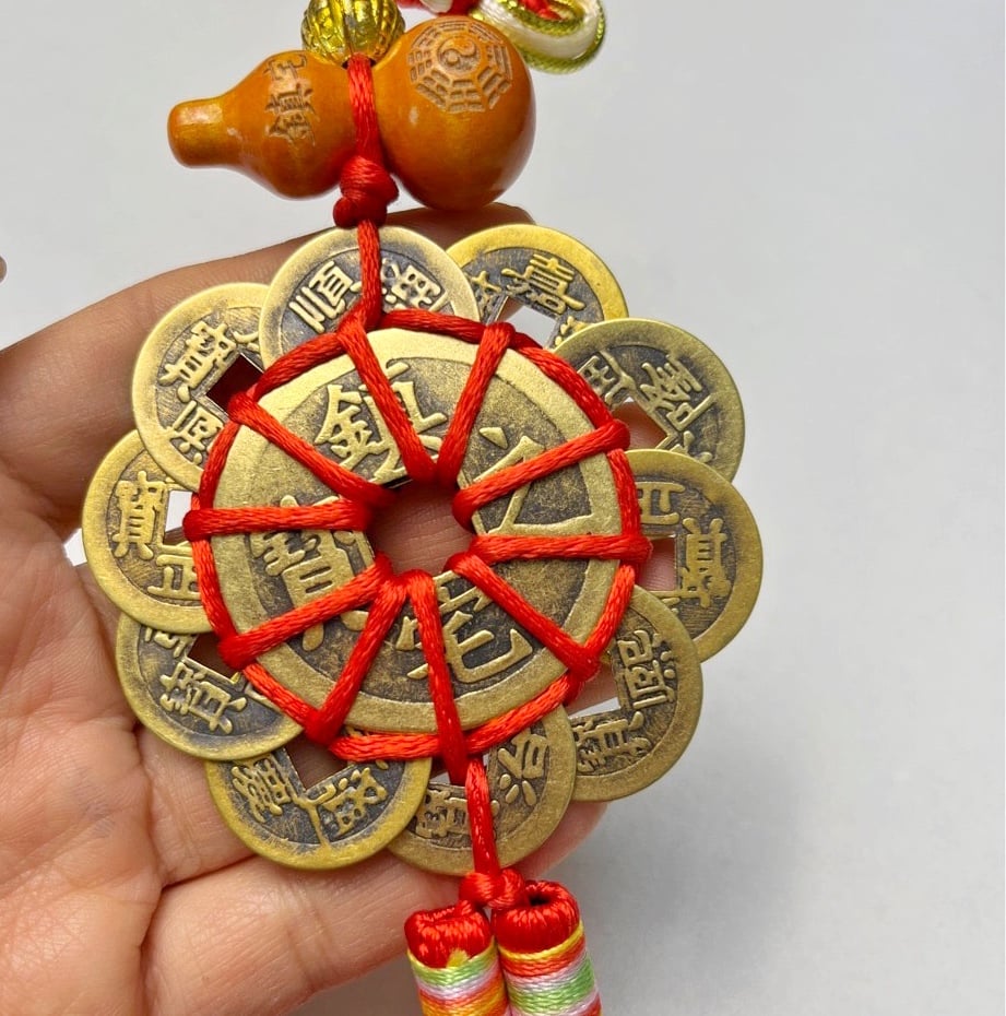 This Peach Wood Gourd with Five Emperor Coins and Plum Blossom Money is an exquisitely crafted Feng Shui charm that brings prosperity, protection, and positive energy to any space. Meticulously adorned with a Chinese knot, a carved Peach Wood Gourd featuring the Bagua symbol (a sign of balance and harmony), and a string of Five Emperor Coins connected by red cords, this item is a powerful Feng Shui tool. The design is completed with elegant tassels, adding a touch of traditional charm. The Five Emperor Coins, made of durable copper, are revered in Feng Shui for their ability to attract wealth and dispel negative energy.