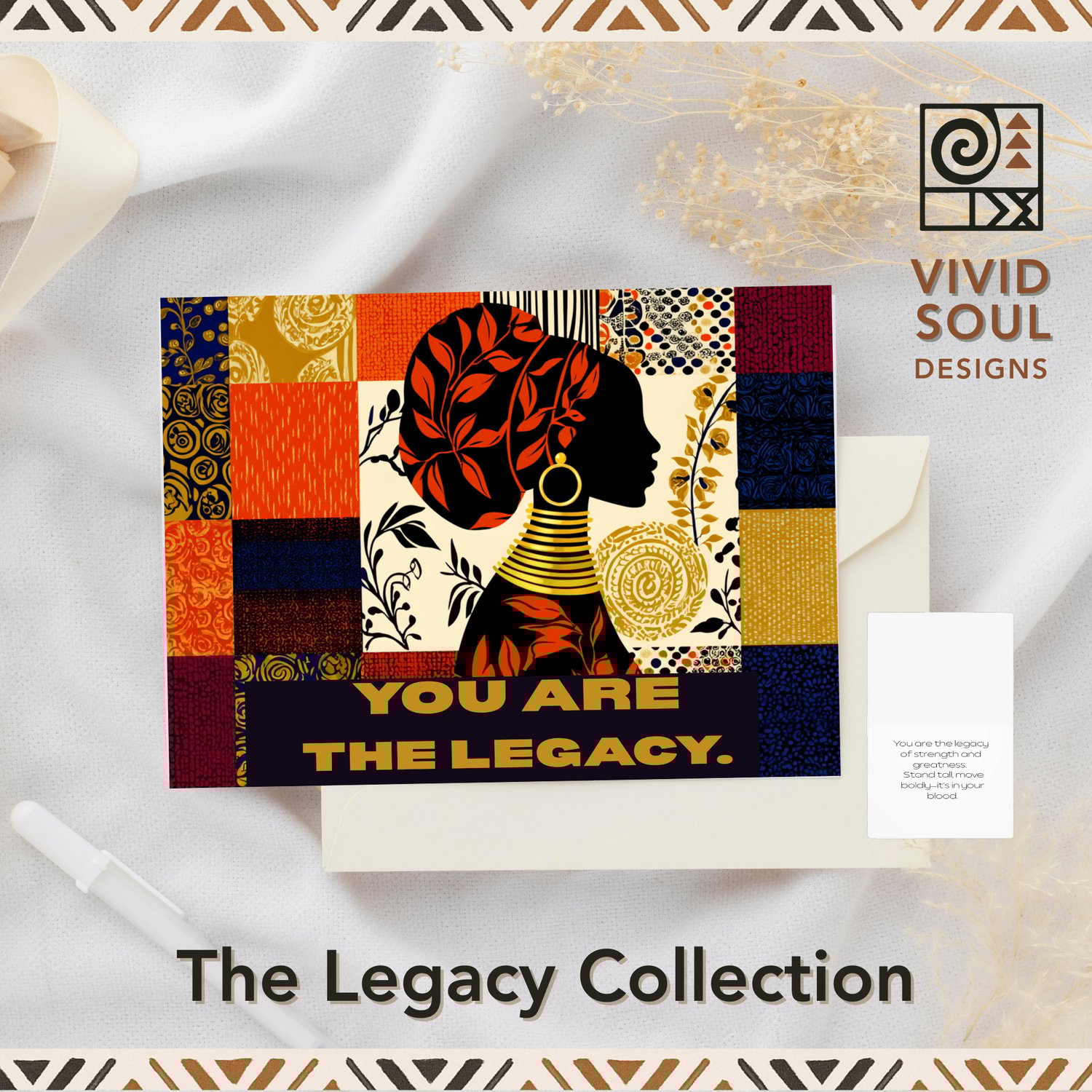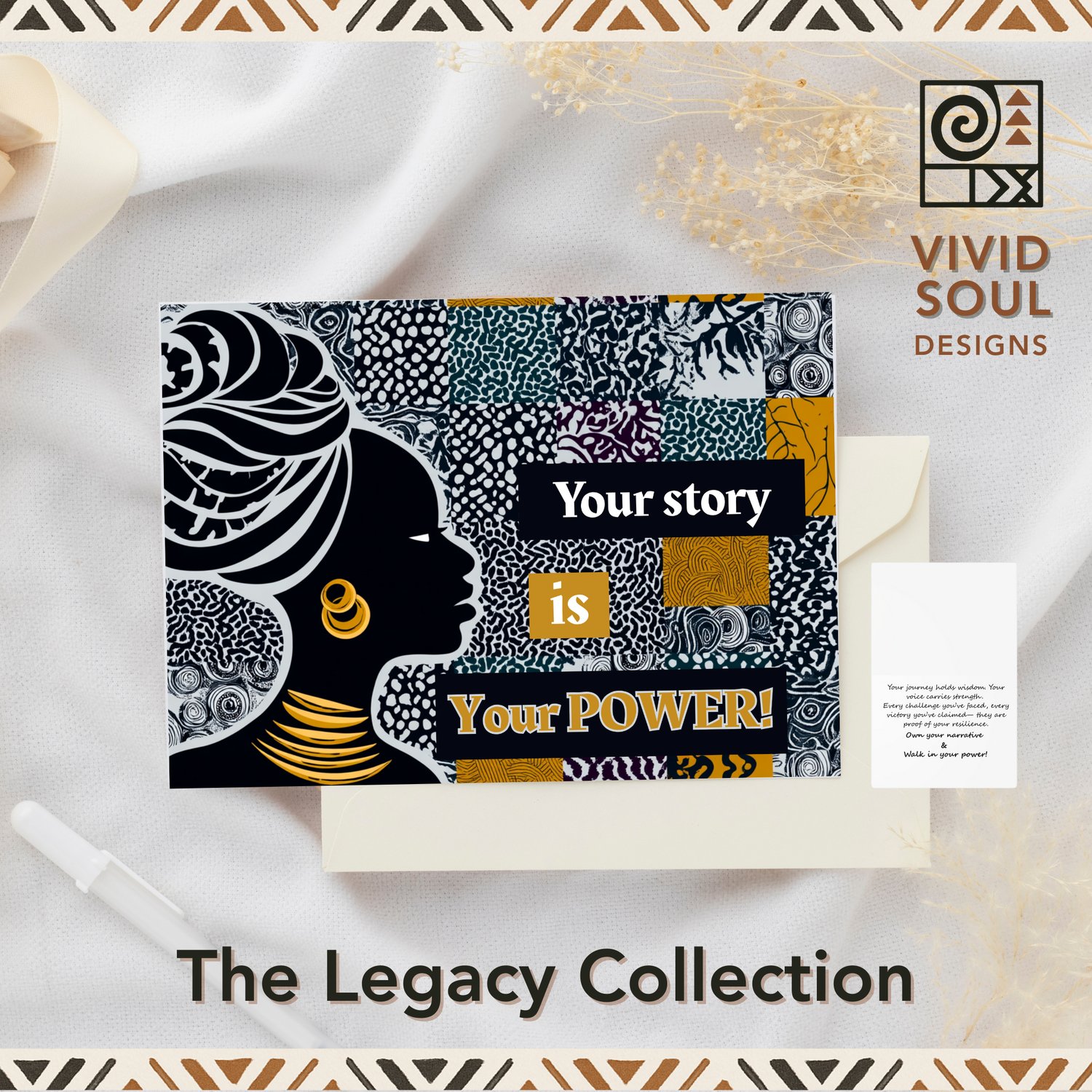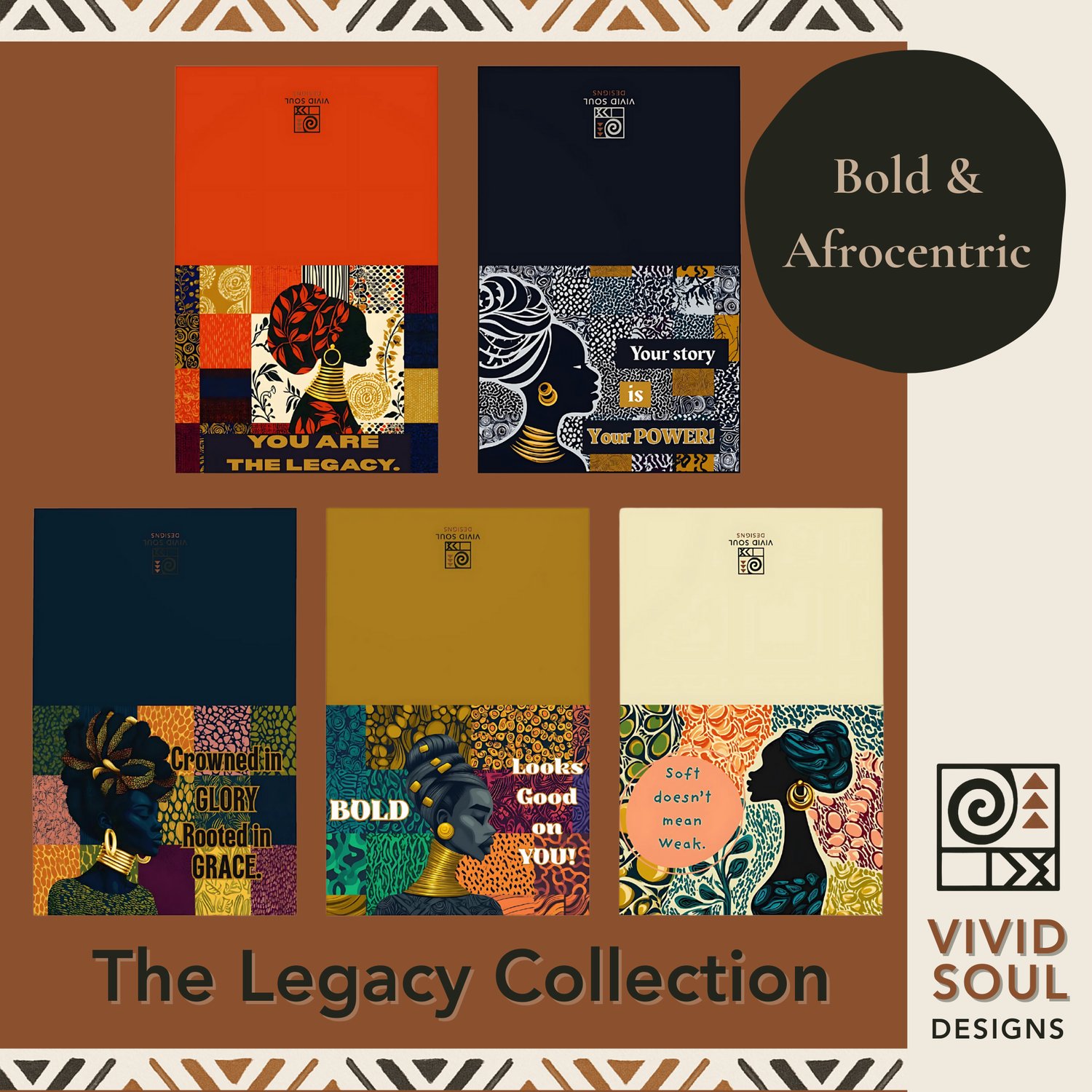 The Legacy Collection is a premium 5-card greeting set that blends bold Afrocentric art with soul-stirring affirmations. Designed to uplift and empower, each card features striking illustrations of Black women wrapped in culture and crowned with grace. Inside, you'll find five unique, heartfelt messages—perfect for celebrating resilience, beauty, and inner power.