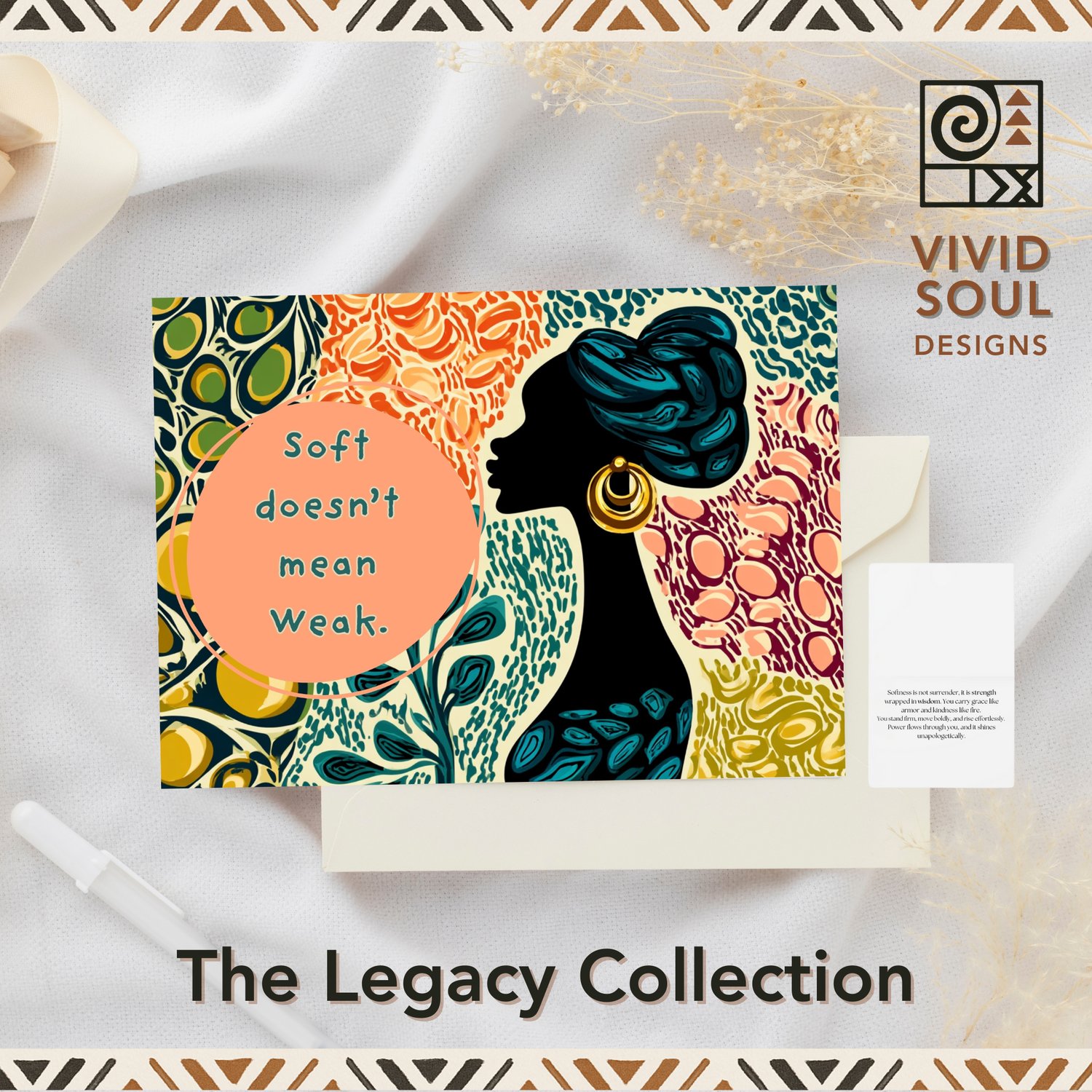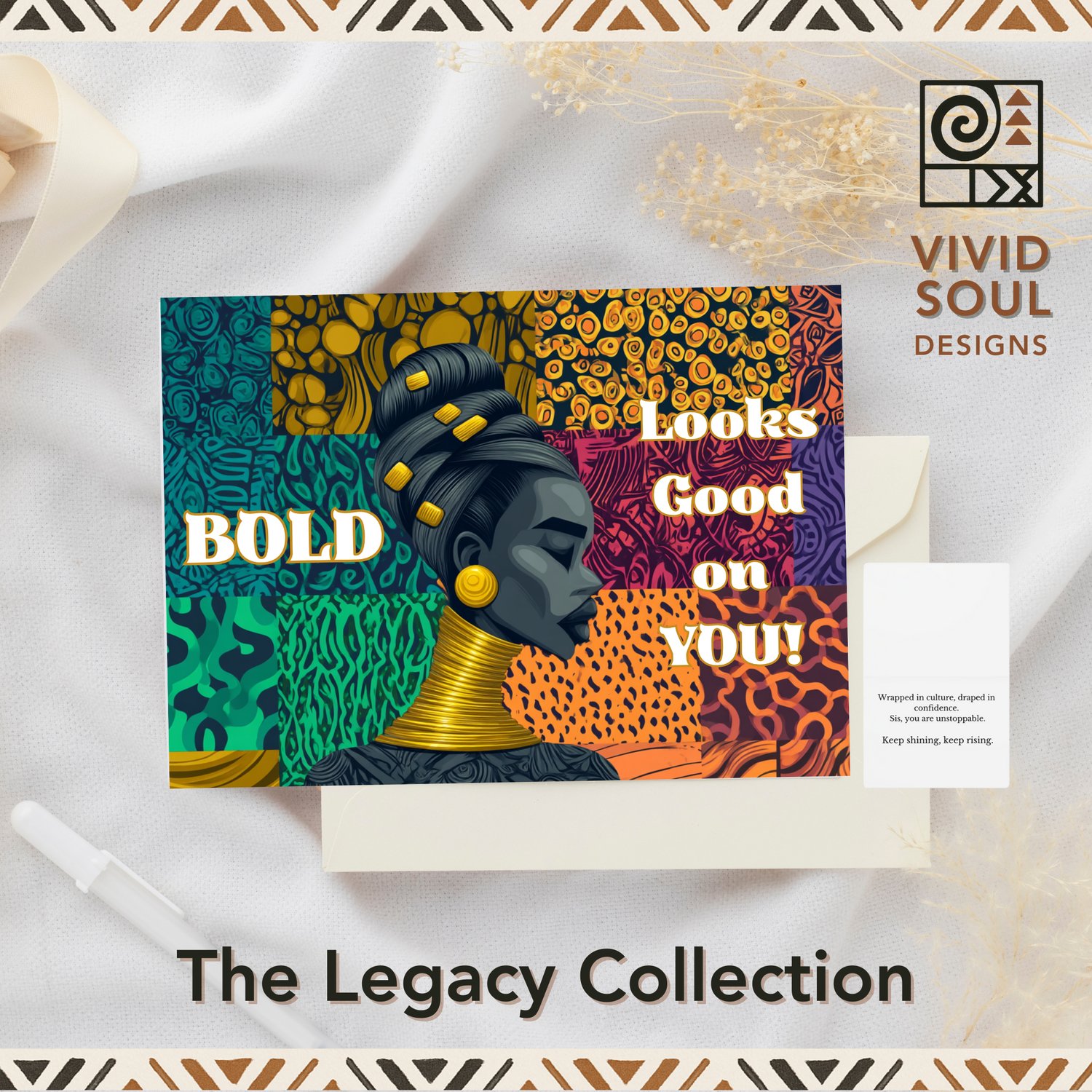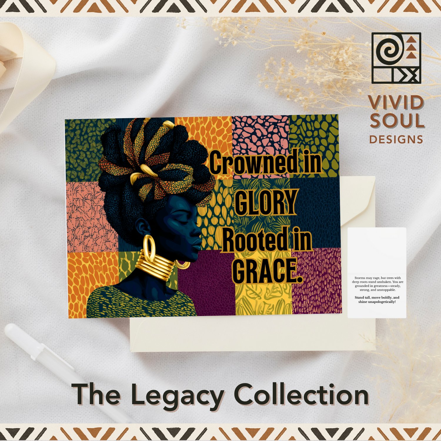 The Legacy Collection is a premium 5-card greeting set that blends bold Afrocentric art with soul-stirring affirmations. Designed to uplift and empower, each card features striking illustrations of Black women wrapped in culture and crowned with grace. Inside, you'll find five unique, heartfelt messages—perfect for celebrating resilience, beauty, and inner power.