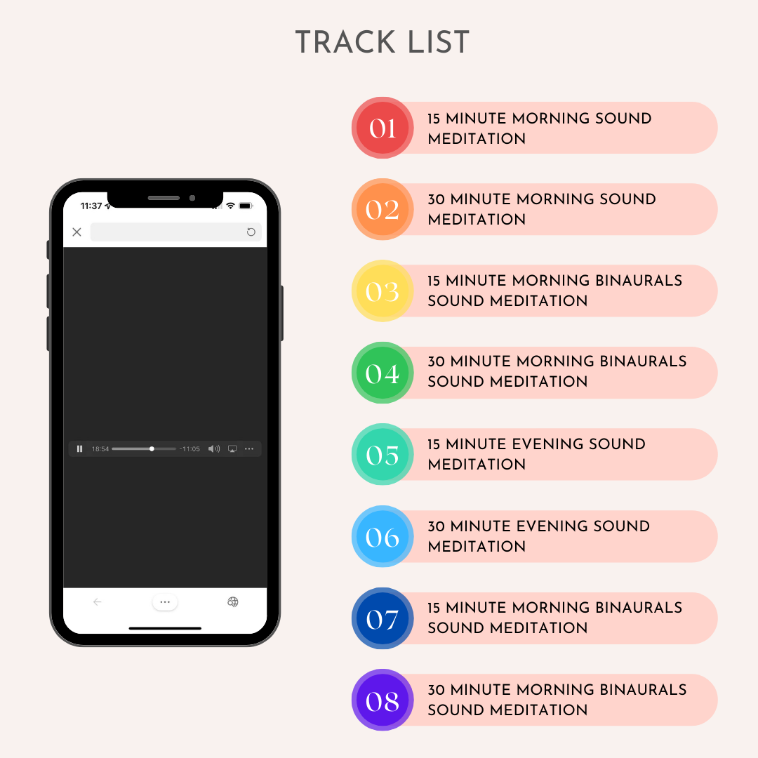 Setting aside just fifteen minutes a day to practice meditation can dramatically improve your health and well-being. This 8 track mp3 album, designed to get your day off to a great start and help you wind down before bed is packed with two 15 and 30 minute morning sound meditation mp3 tracks comprised of 741 Solfeggio frequencies, crystal chimes and singing bowls and two more featuring additional beta wave binaurals and two 15 and 30 minute evening sound meditation mp3 tracks comprised of 528 Solfeggio frequencies and healing dream music and two more featuring additional delta wave binaurals. You will also receive 'A Guide To Sound Meditations PDF Workbook.