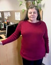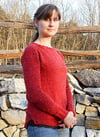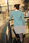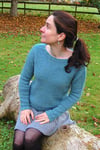 The body of this sweater is knit in the round top down from the collar to the hem in one piece with short rows that shape the saddle shoulders and drop the neck at the centre front and back, also raising the back neck slightly compared to the front. Sleeves are separated from the body and cuffs knit down separately. The bottom hem is worked flat. The construction method is a specially designed hybrid contiguous/saddle shoulder. You may want to have knitted some sweaters previous to trying this pattern as there is some challenge in the short row shaping.