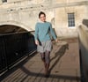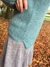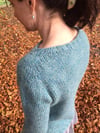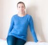 I used New Lanark 90% wool 10% silk aran in colourway blue lovage. You could use any wool or acrylic aran/heavy worsted yarn with which you can achieve gauge. An admixture of silk in the yarn gives beautiful drape to this garment, but is not essential.
