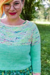 The remainder of the yoke, body, and sleeves are knit in stockinette stitch. Cuffs, hem & short-row neckline are knit in twisted rib.