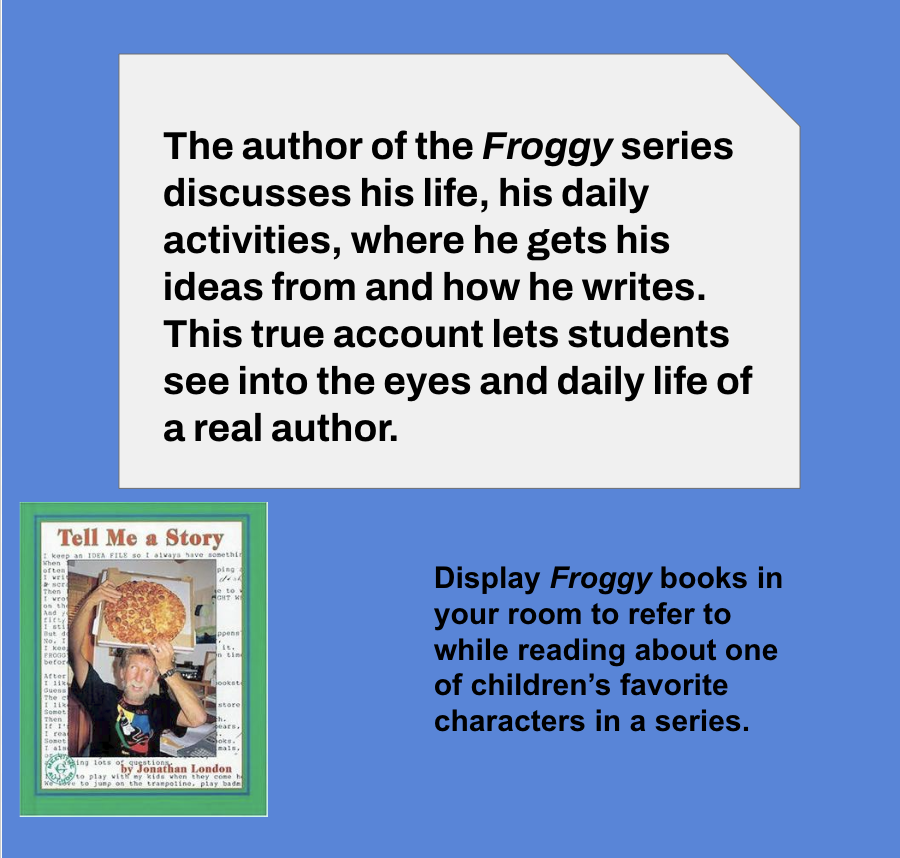 The book, Tell Me a Story By Jonathan London, is written by the author about his life as the author of Froggy books and other children books.