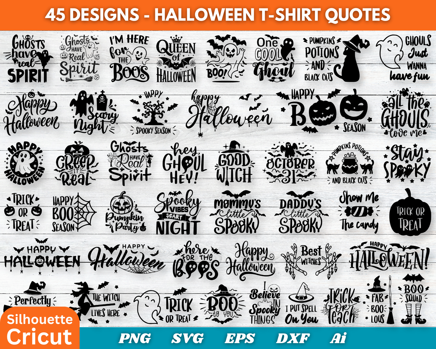 Halloween Day SVG Bundle, 45 Funny Spooky Quotes, Witch Ghost Skeleton Svg Png Eps Dxf, Halloween Shirt Designs for Cricut & Sublimation