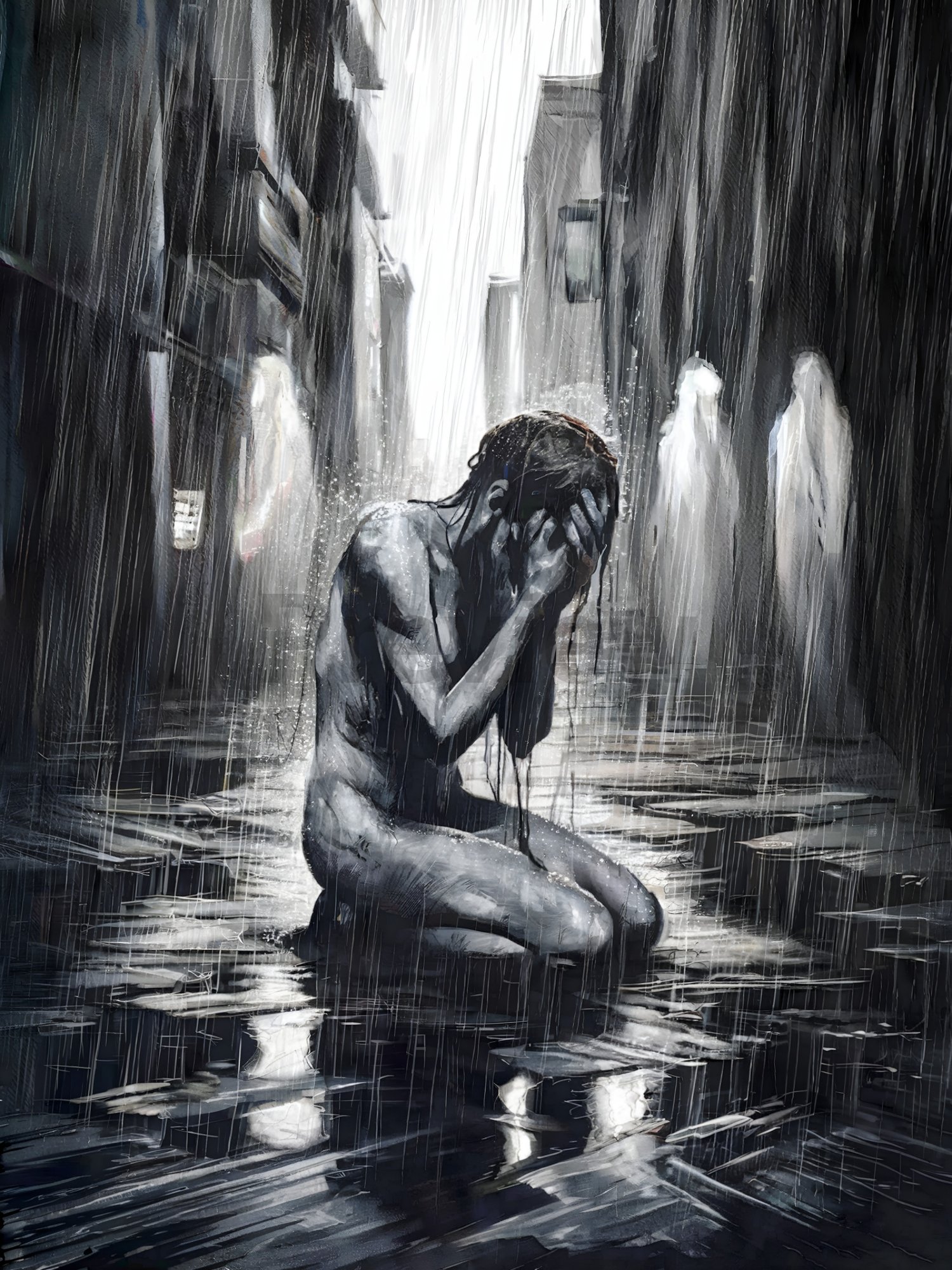 The torrential rain is captured with dynamic vertical lines, creating deep puddles on the ground that reflect the muted light and the surrounding decaying architecture. Behind her, two ghostly, spectral figures emerge from the shadows, subtle yet ominous, acting as silent, ethereal witnesses to her suffering. This piece masterfully blends dark fantasy, Gothic horror, and emotional portraiture, creating a powerful narrative of inner torment, loneliness, and supernatural dread. A compelling addition for collectors of atmospheric, dark, and expressive digital art.