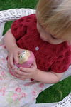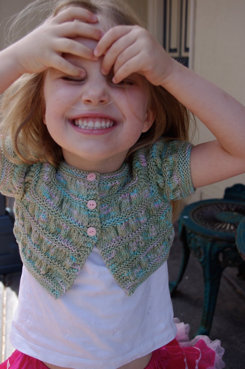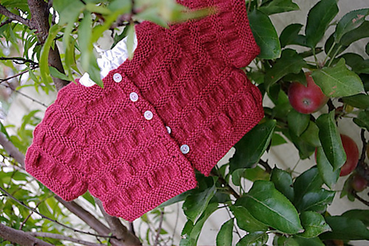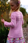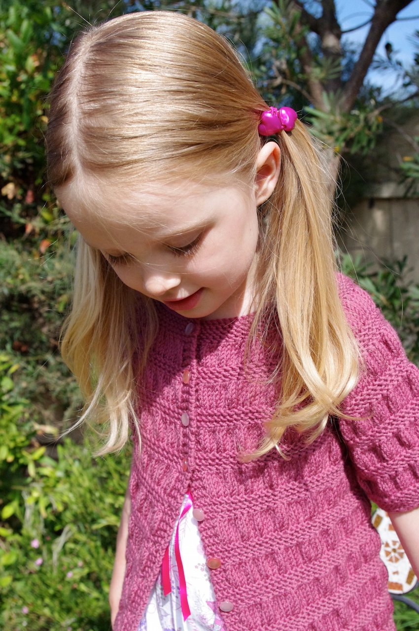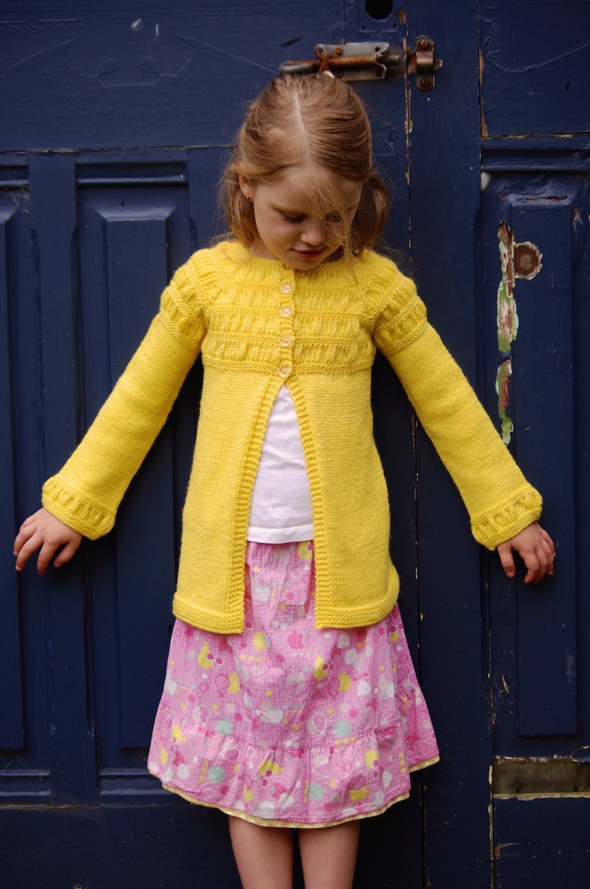 Cardigan Version 2 features a gathered bodice, a stocking stitch body and long sleeves with two different cuff options; gathered or garter.