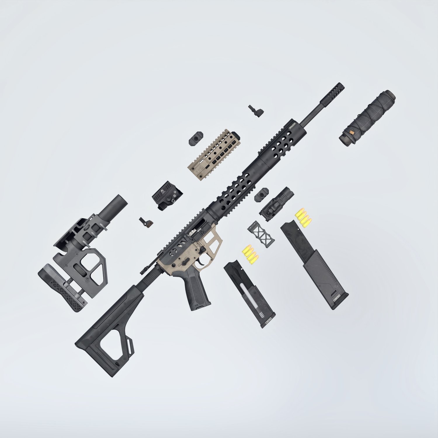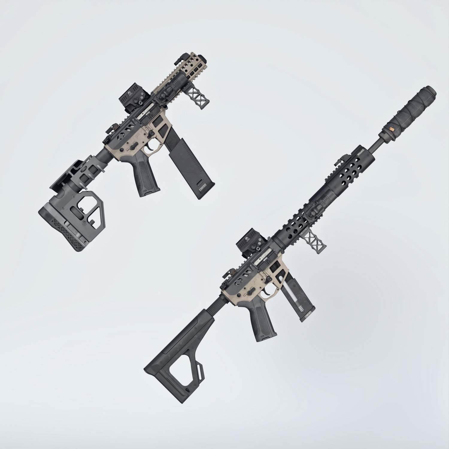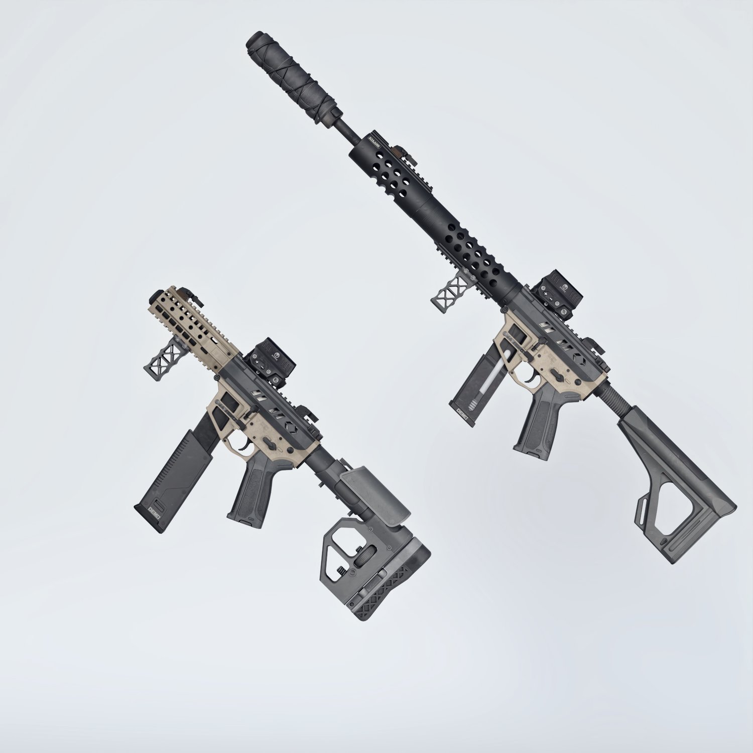 A cool looking fictional submachine gun. Inspired by some real life submachine guns, like CMMG MKG, it gives a nice pistol caliver firepower in a cool looking package. Converted and rigged for use with DAZ. Trigger, safety, bolt etc also rigged for more realistic pictures. Includes many accessories to be configured in at least 2 distinct looks, like a longer version and a short one. 2 handgrips, front grip, light, red dot, iron sights, 2 mags, 2 stocks etc, for various porpoises and pictures. Short barrel includes an integrated silencer. Since parts are rigged, the gun can be used as just the basic configuration or an upgraded tactical variant.