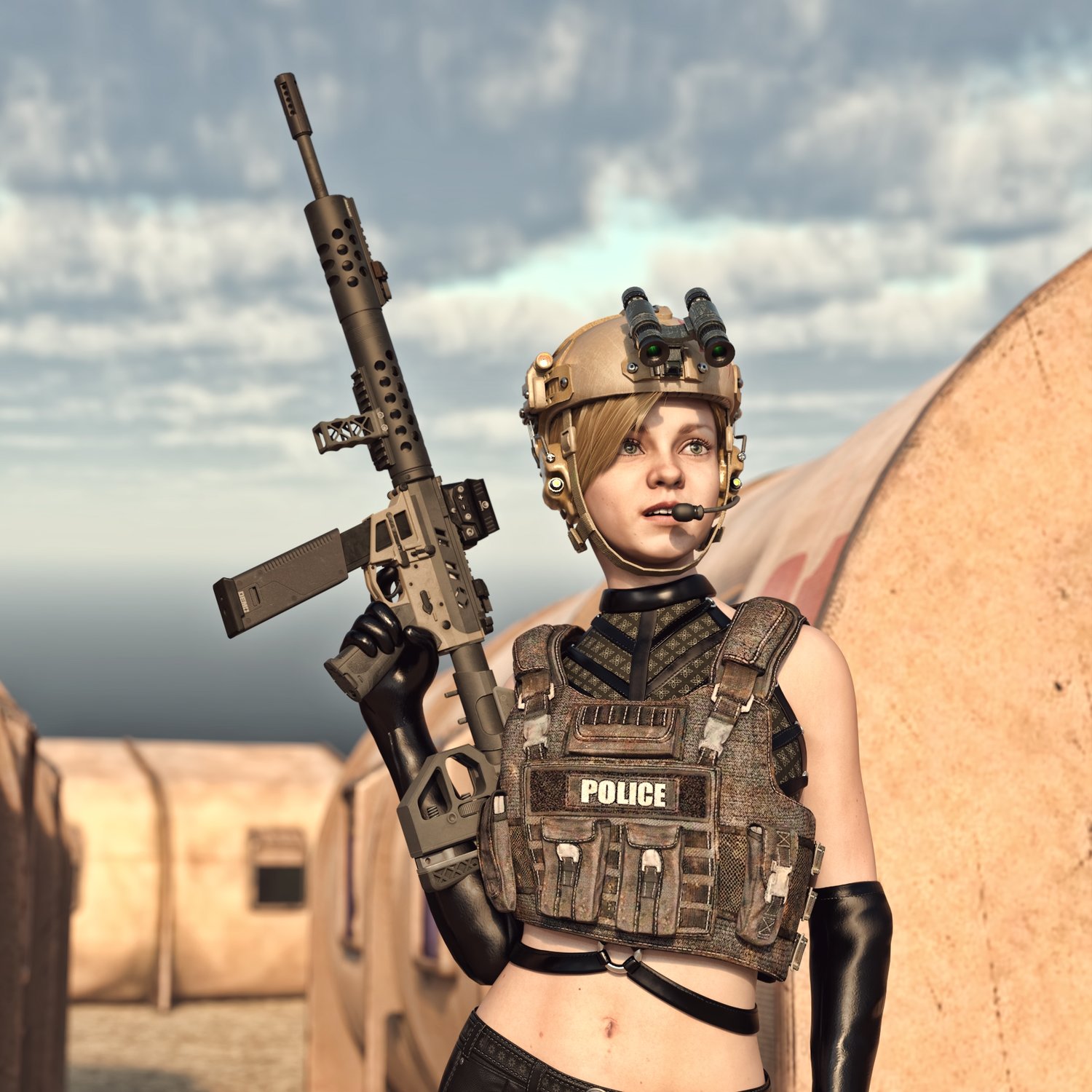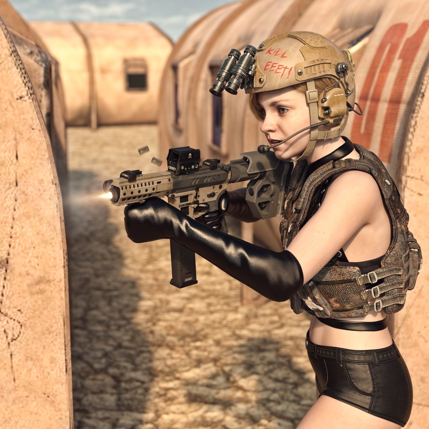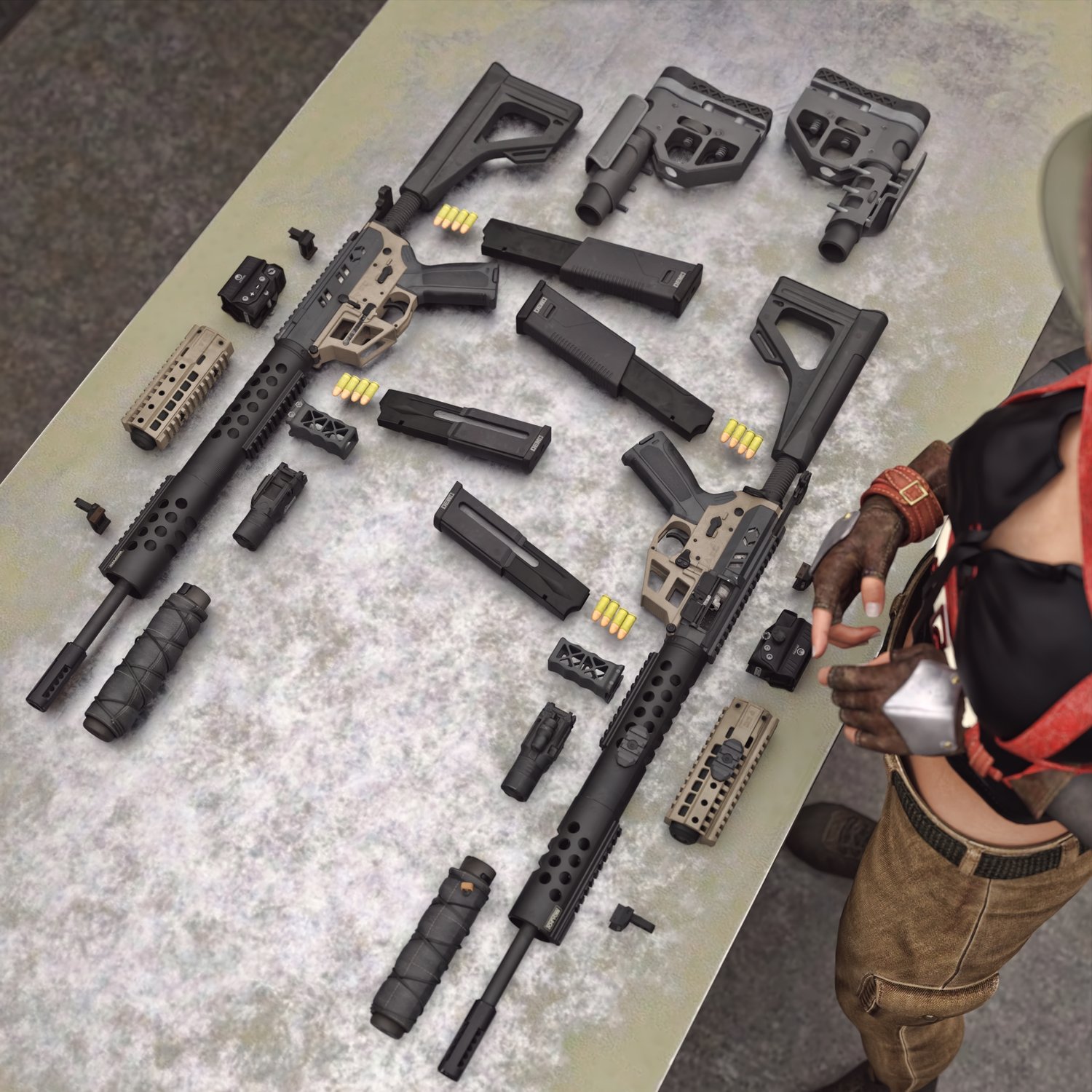 A cool looking fictional submachine gun. Inspired by some real life submachine guns, like CMMG MKG, it gives a nice pistol caliver firepower in a cool looking package. Converted and rigged for use with DAZ. Trigger, safety, bolt etc also rigged for more realistic pictures. Includes many accessories to be configured in at least 2 distinct looks, like a longer version and a short one. 2 handgrips, front grip, light, red dot, iron sights, 2 mags, 2 stocks etc, for various porpoises and pictures. Short barrel includes an integrated silencer. Since parts are rigged, the gun can be used as just the basic configuration or an upgraded tactical variant.