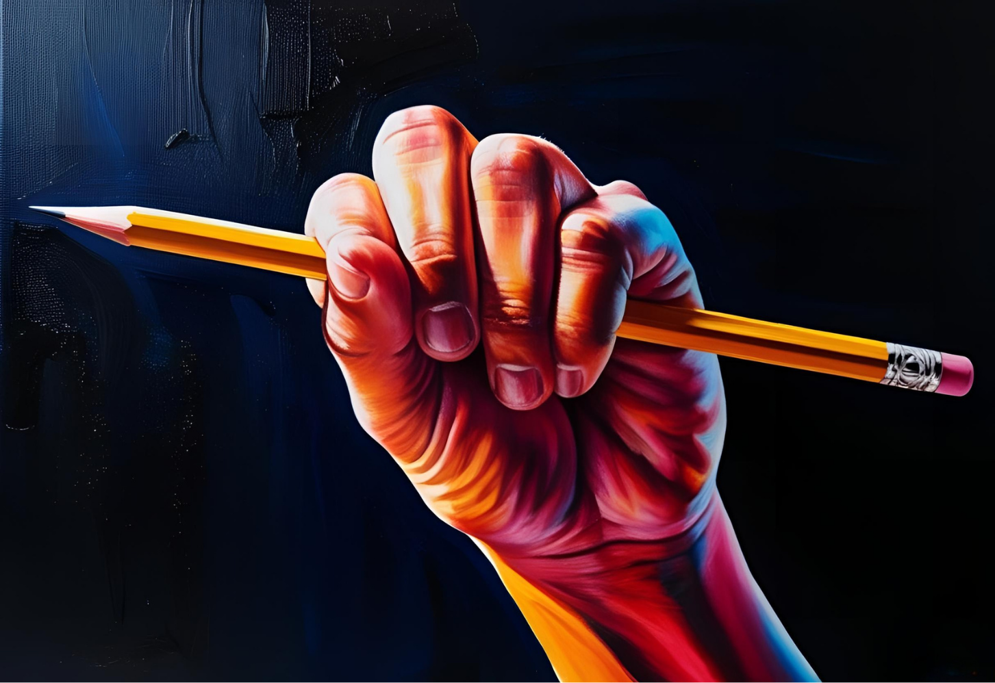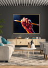 "Hand That Holds the World" radiates creative power, depicting a determined fist grasping a golden brush against a dramatic backdrop of deep midnight blue and rich shadow. The painting's striking contrast is achieved through warm flesh tones, vibrant orange and red highlights, and the luminous yellow of the artist's tool, creating a composition that is both bold and inspiring. The masterful use of light and shadow against the dark background evokes a sense of artistic determination and creative force, inviting viewers to witness the moment where human passion and artistic vision unite in this powerful, illuminated gesture of creative expression.