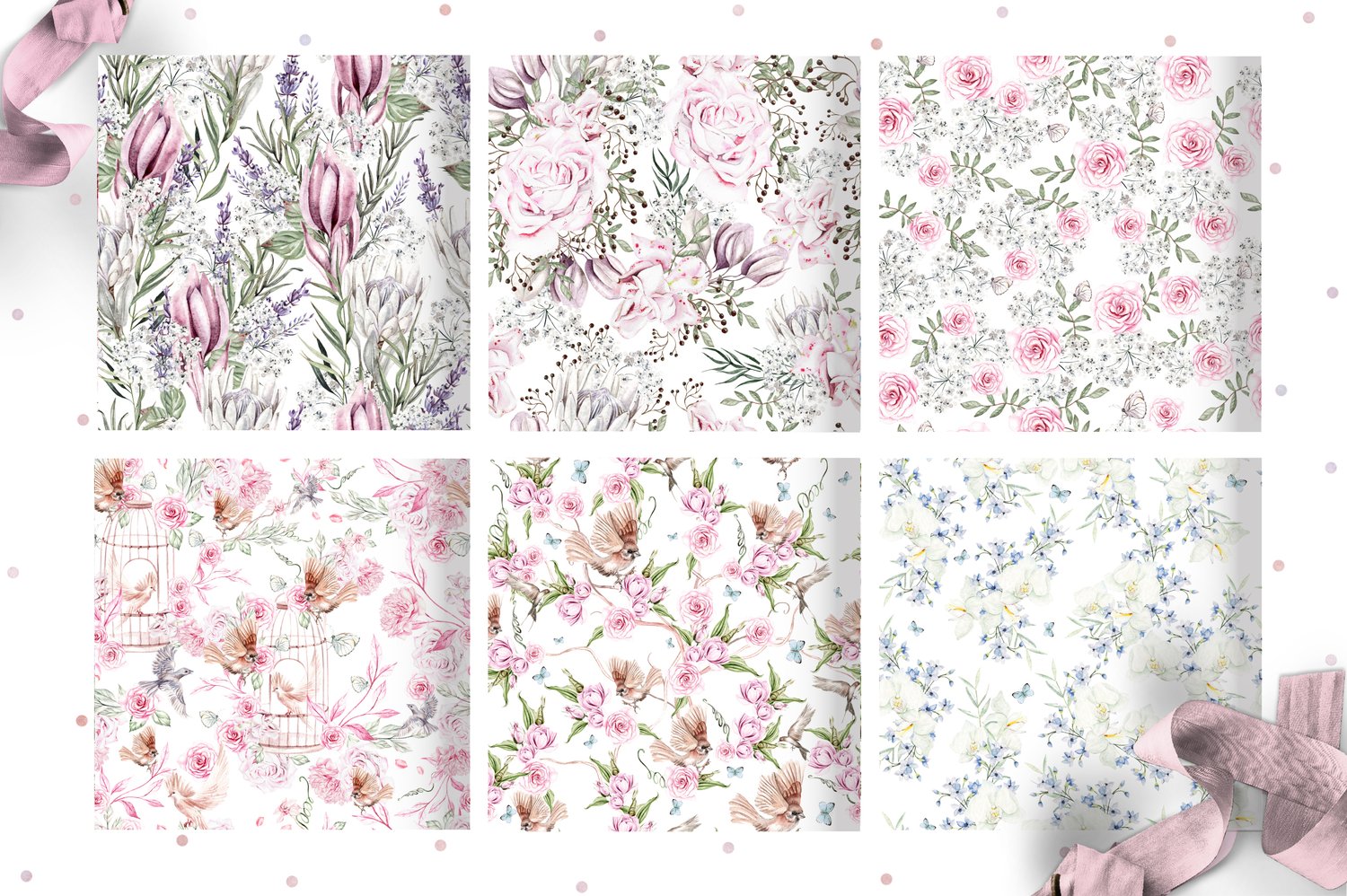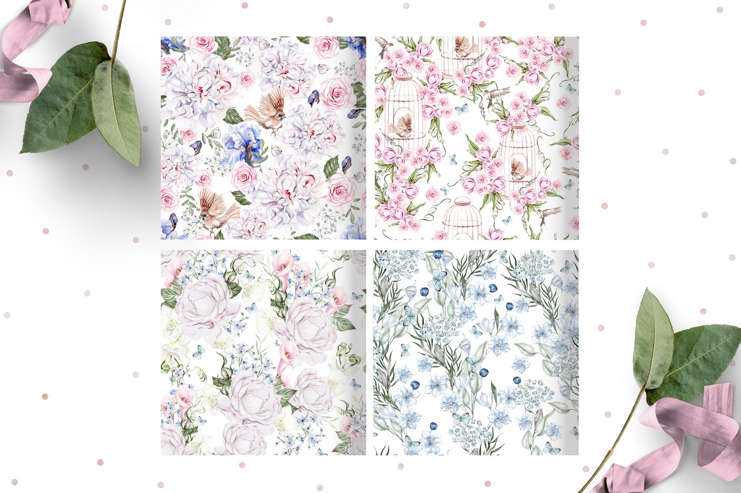 I present you a new set of 10 watercolor flower seamless patterns with bright and colorful watercolor rose, iris, peony birds and leaves.