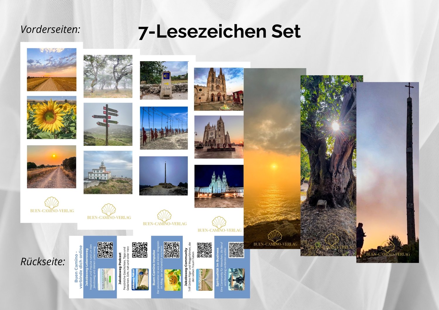 Dieses Set vereint sieben Motive vom Jakobsweg, die mehr sind als Bilder. Jedes Lesezeichen trägt eine Botschaft – ein Gefühl, das du vom Camino mit in deinen Alltag nehmen kannst.