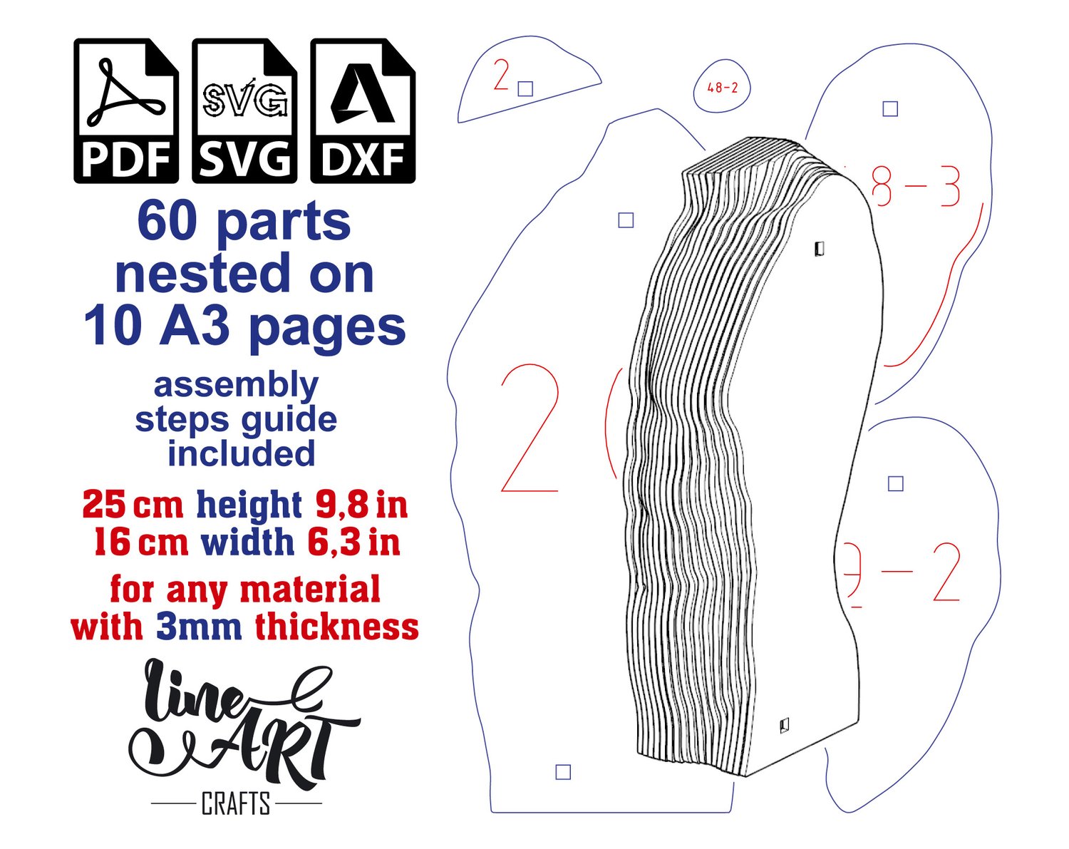 This is not a physical product! This is a digital download of a vector template (plan drawings) file to make sculpture yourself out of any material with 3 mm thickness (like plywood, mdf, acrylic, cardboard, etc.) with laser cutter or scroll saw. Glue is required.