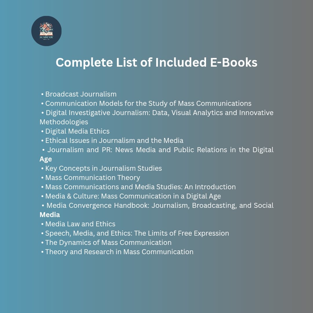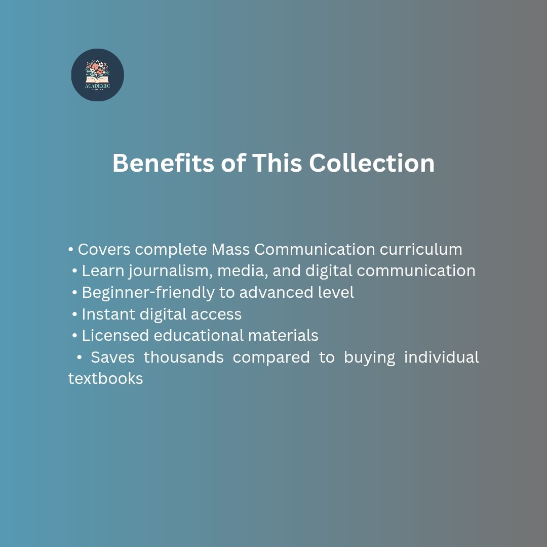 This comprehensive collection covers mass communication theory, journalism ethics, media law, digital journalism, media culture, and modern communication strategies used in today’s digital media industry.