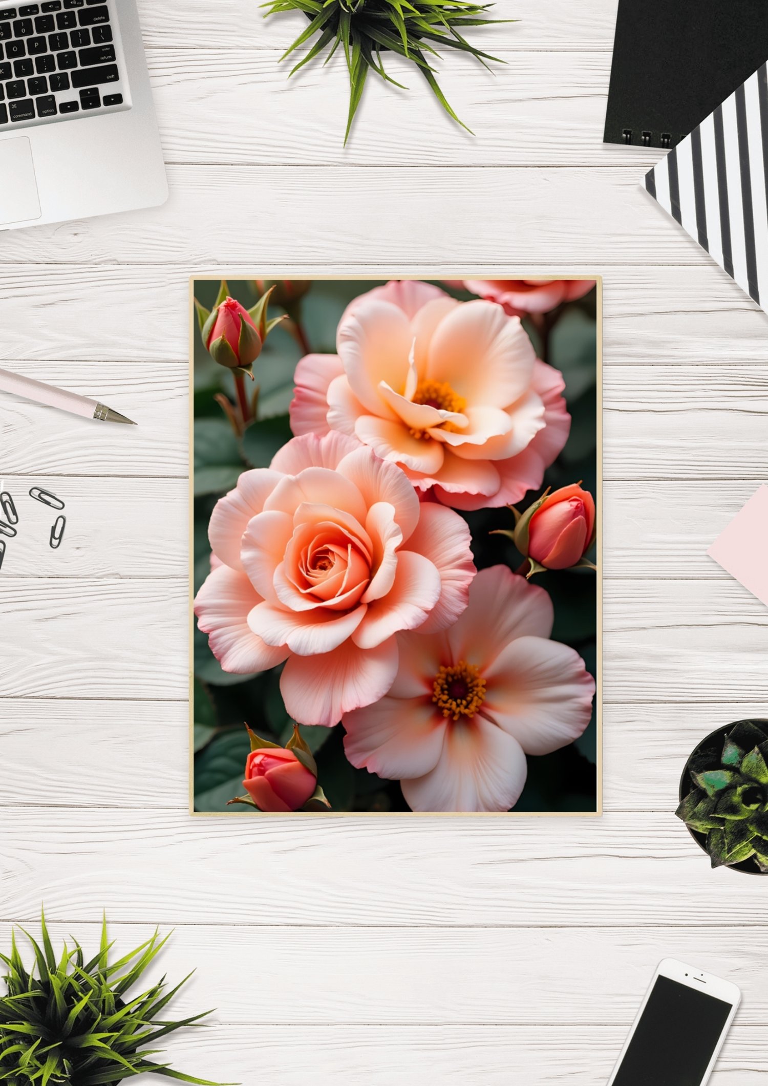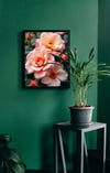 This beautiful image captures the delicate beauty of peach and pink roses in full bloom. The soft hues of the petals and the vibrant green foliage create a harmonious and captivating scene. The image focuses on the intricate details of the rose blossoms, showcasing their elegant form and velvety texture. This image was created using AI as a visualization tool.