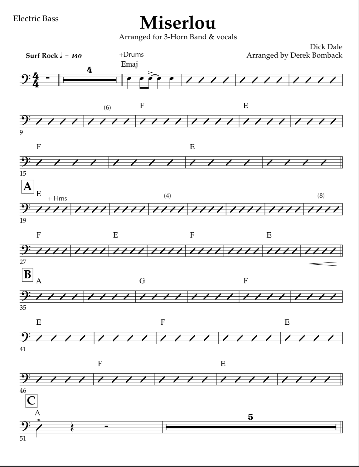 Miserlou by Dick Dale. Key of E minor. Arranged for Trumpet, Tenor Sax, Trombone, Guitar, Piano, Bass & Drum Set. *This is an instrumental arrangement that features the Guitar.