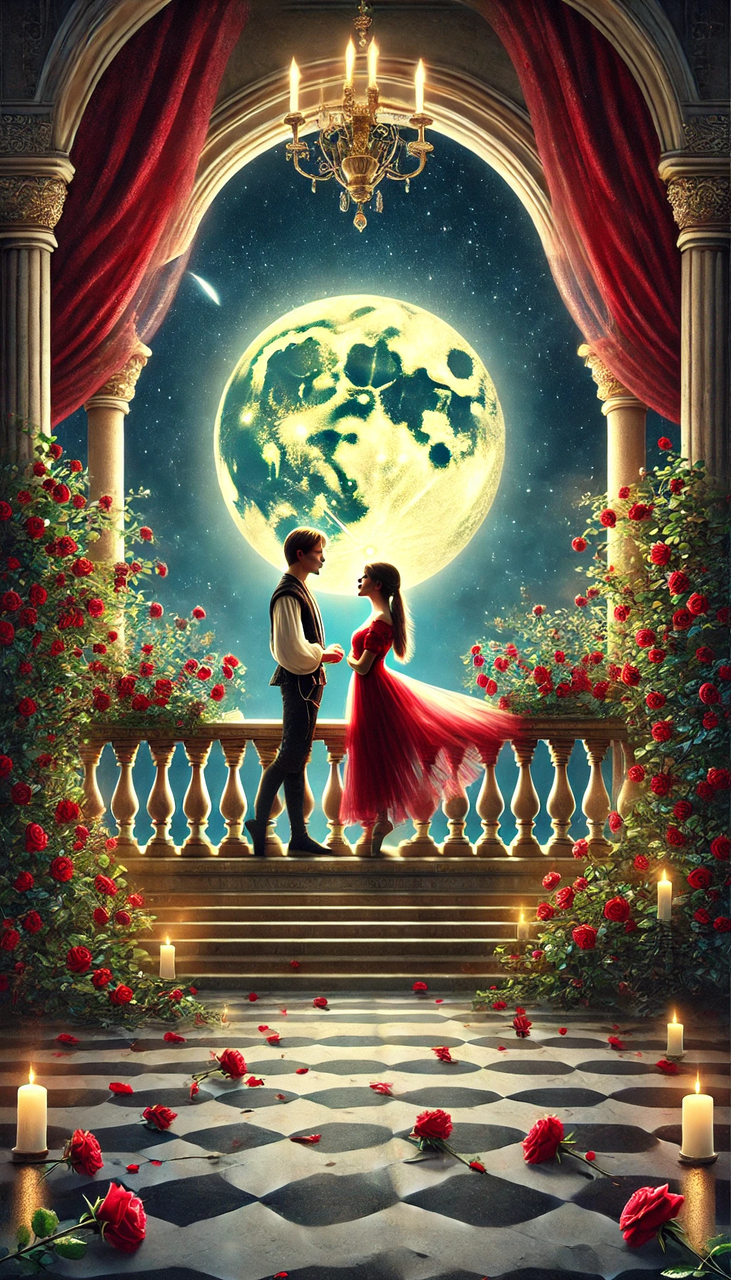 Capture the essence of eternal love in this romantic digital artwork featuring Romeo and Juliet on a grand moonlit balcony.