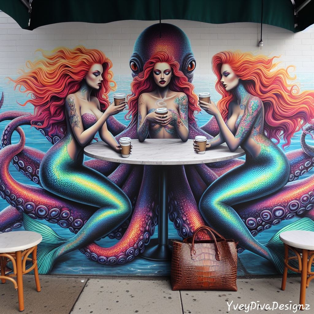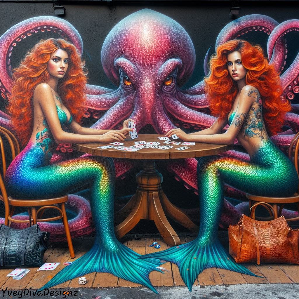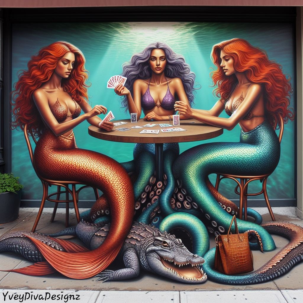 Three enchanting mermaids with cascading red hair sit poised at an octopus-shaped card table, their eyes gleaming with mystery and intent. At their feet, crocodiles or crocodile bags lounge as loyal guardians, adding a touch of wild intrigue to this otherworldly game of fate.