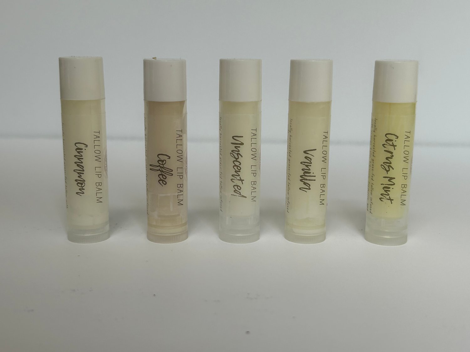 All lip balms are tallow based and are combined with beeswax plus additional herbs, natural colors, and/or essential oils. Currently offering Vanilla, Coffee, Unscented, and Citrus Mint.