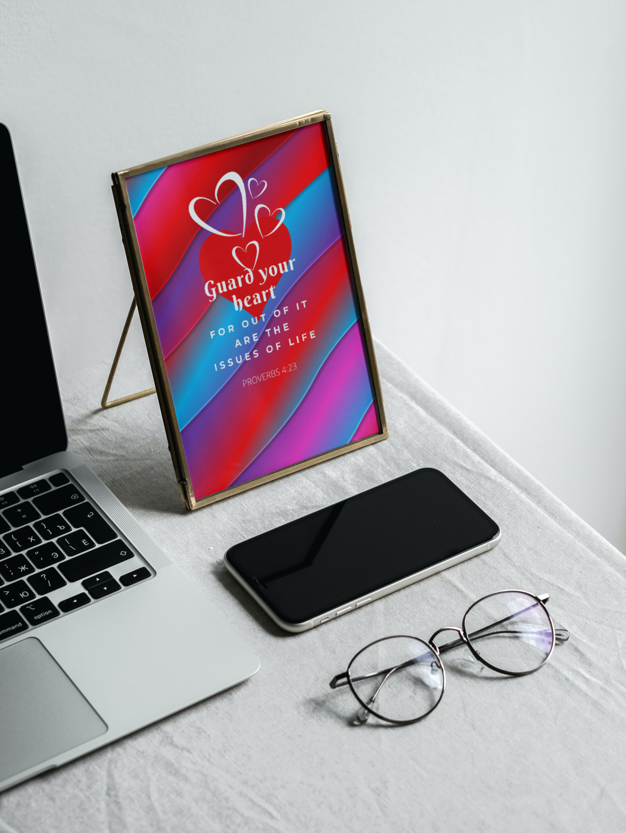 Proverb 4:23 tells us to "Guard Our Heart for out of it are the issues of life". This vibrant colored design will help to inspire and remind everyone how important God's Word is for our lives.You will receive these sizes: You will receive these sizes: 5x7 8x10 11x14