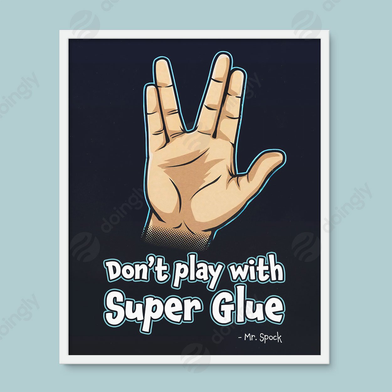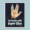 Live long and laugh often! This “Don’t Play with Super Glue” image is a playful nod to classic sci-fi culture — featuring the iconic Vulcan hand gesture and Mr. Spock’s signature wit. Perfect for Trekkies, geeks, and anyone who appreciates clever humor in their home or office décor.