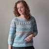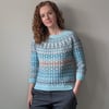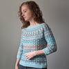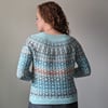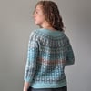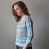 Tilework is knit from the top down in the round. The collar is cast on first, with short rows used to shape the neckline. The colourwork chart is established and carries through to the underarm. The yoke is divided into sleeve and front and back stitches, with the sleeve stitches put on hold. Underarm stitches are cast on, and the body continues in the round to the hem. The sleeves are taken off of hold, and worked from the top down to 3/4 length in the same pattern as the bodice.