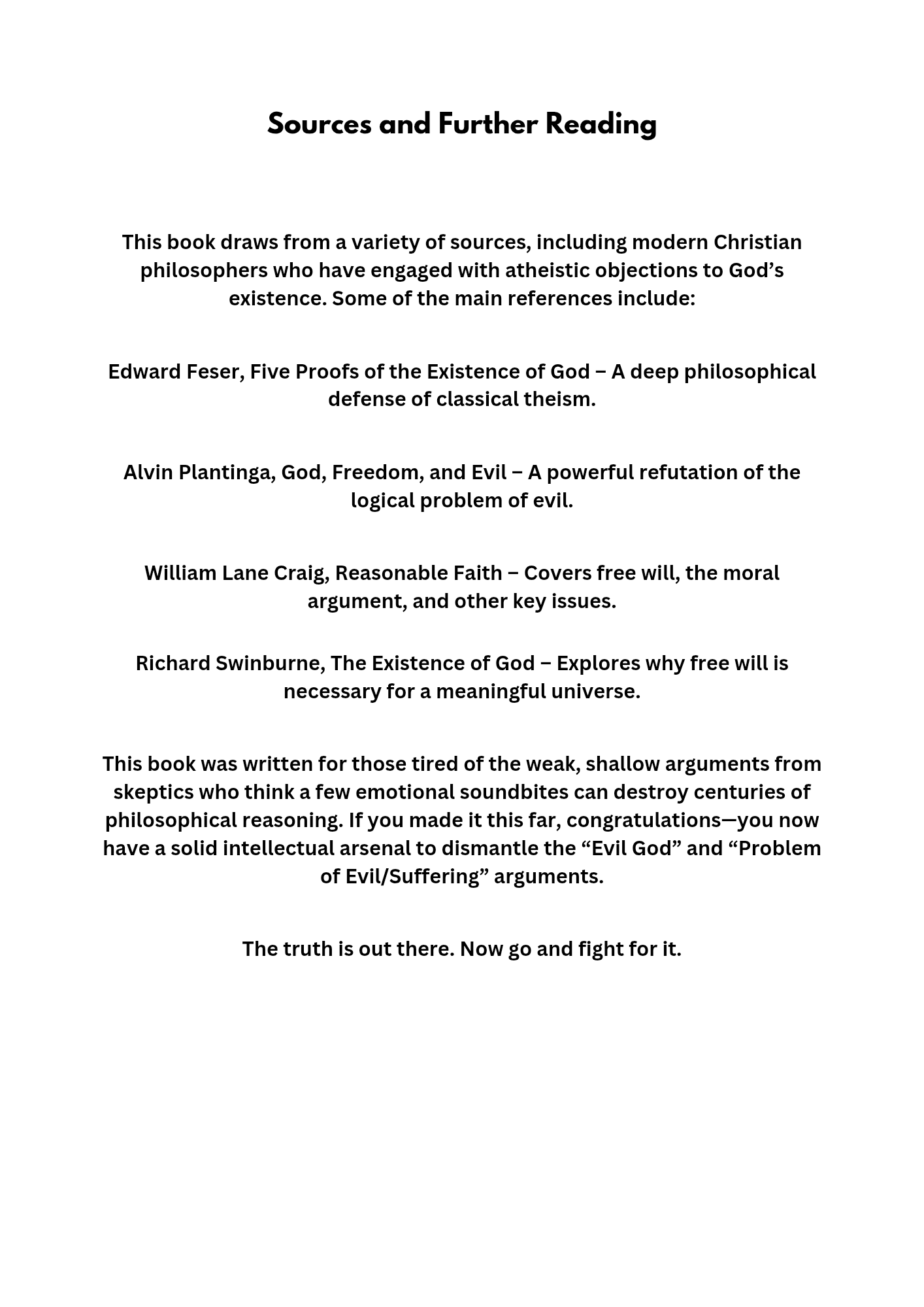 Packed with rigorous logic, philosophical depth, and a no-nonsense approach, this is not just a defense—it’s a counterattack. If you're ready to challenge the critics and explore the real philosophical foundations of God, free will, and suffering, this book is for you with only 40 Pages Refuting Atheists Objections and Counter-attack againts their arguments.