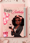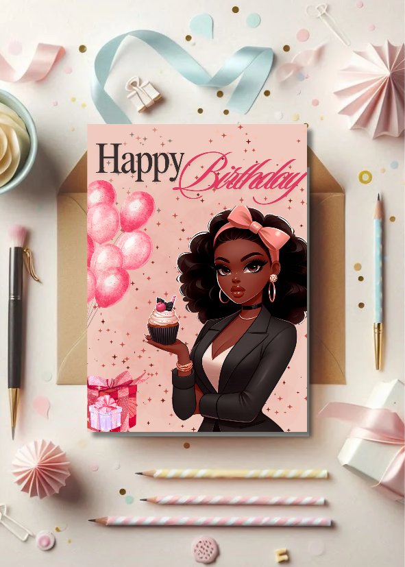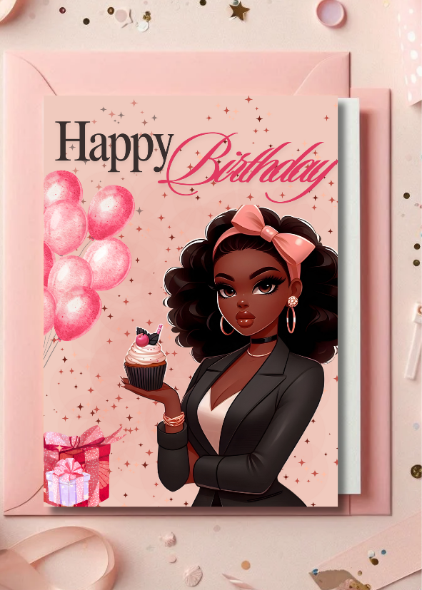 Celebrate her special day with our stunning 'Sweet Sophistication' Black Girl Birthday Card, available as an instant digital download! This unique printable e-card features an exquisitely illustrated Black girl in a chic suit, adorned with a stylish pink bow, surrounded by festive balloons and gift boxes.