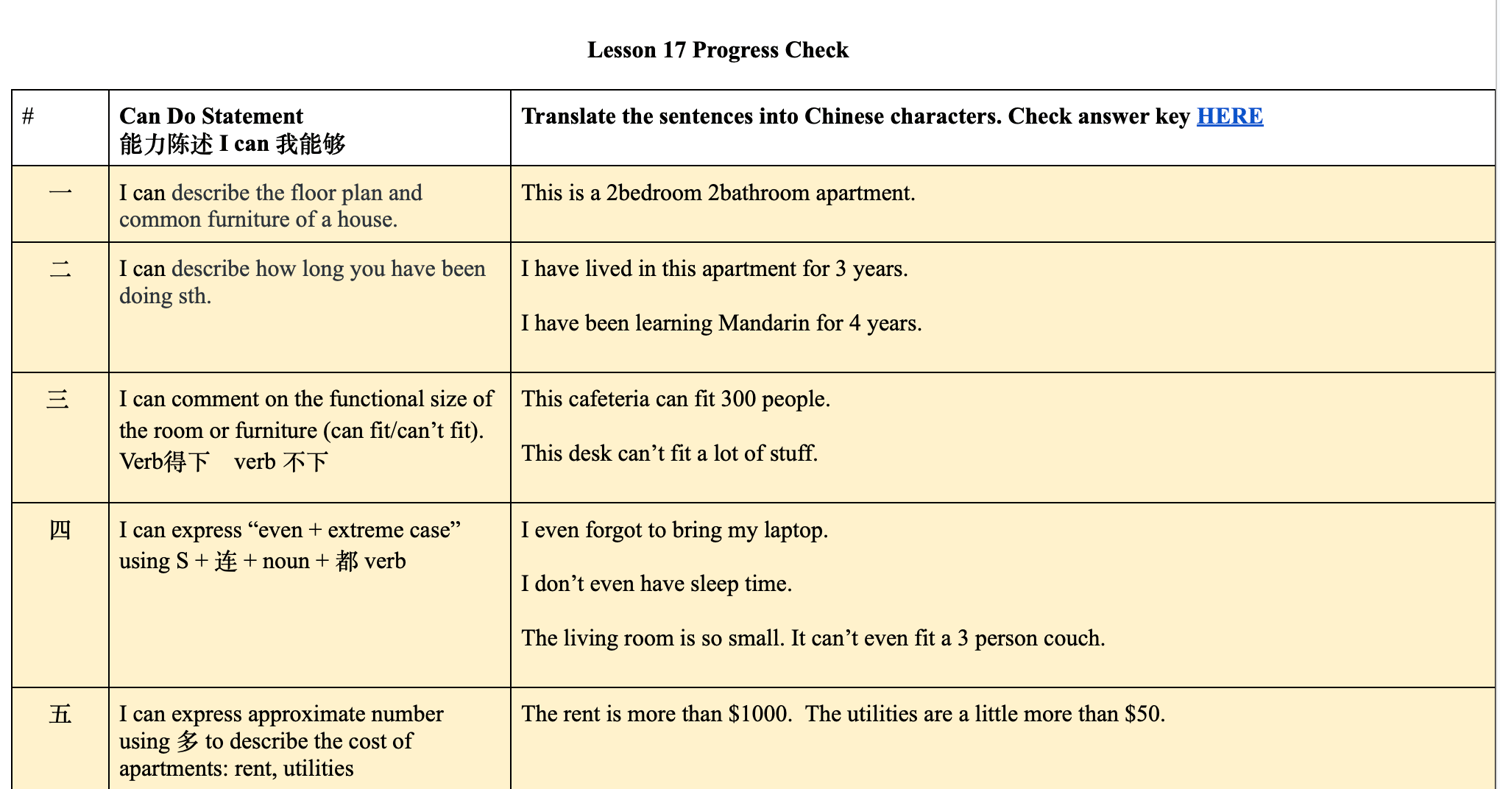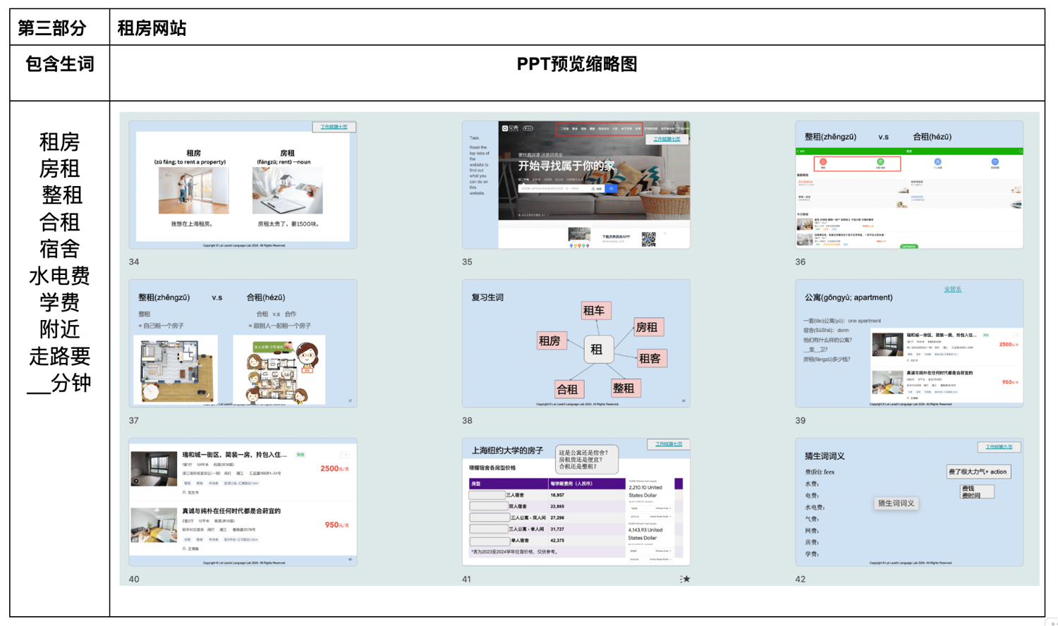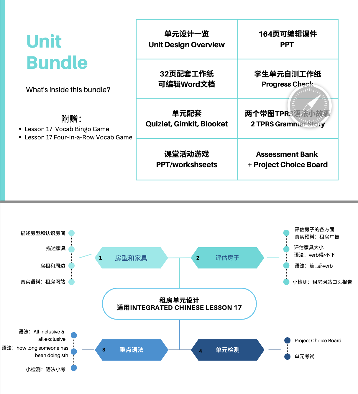 这套“租房”单元,采用反向设计(backward design)原理精心打造,旨在帮助学生在真实的语境中熟练掌握《中文听说读写》(Integrated Chinese) 课本第十七课《租房》的核心词汇和语法点。