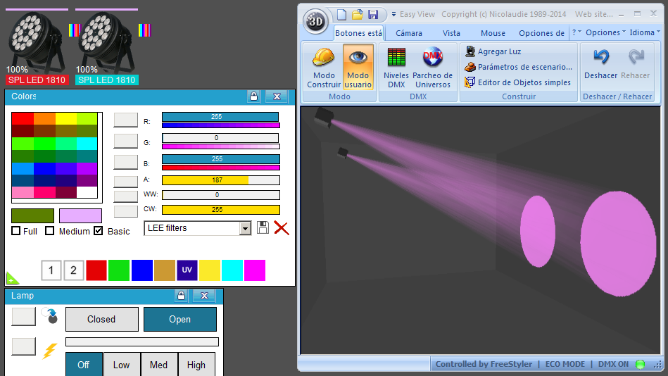 Esta Librería SSL2 está optimizada para trabajar con Magic 3d Easy View. Es decir para ver una representación 3D de las secuencias que estemos realizando con Freestyler, QLC+ o cualquier otro soft que se conecte con Magic 3d.