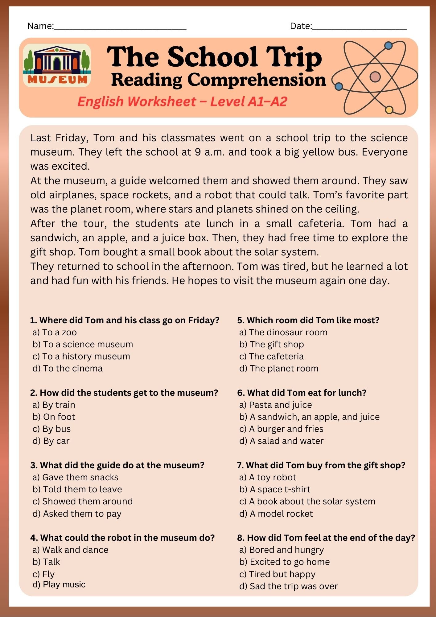 This beginner-friendly reading comprehension worksheet is ideal for A1–A2 ESL/EFL learners. The story follows Tom and his class on a fun and educational school trip to the science museum. With relatable vocabulary and past simple structures, this resource is perfect for building reading skills and confidence.