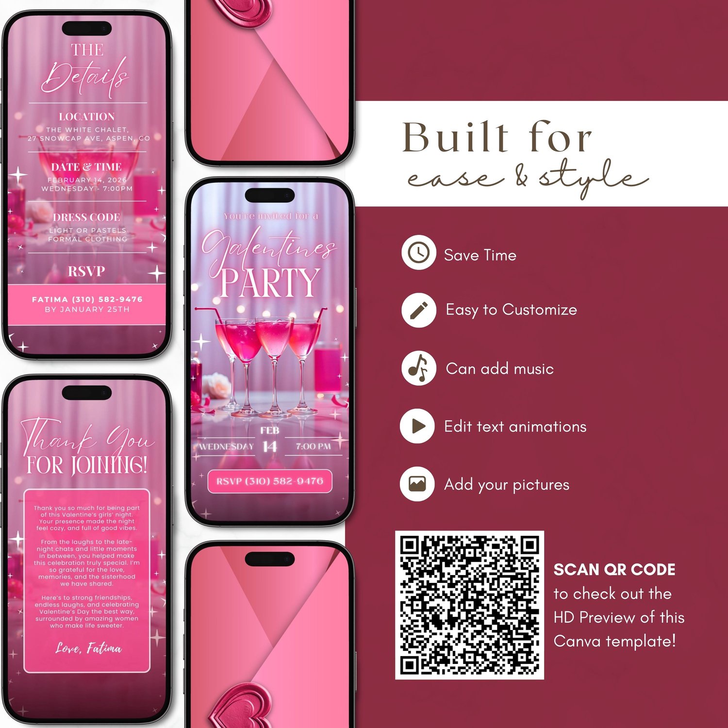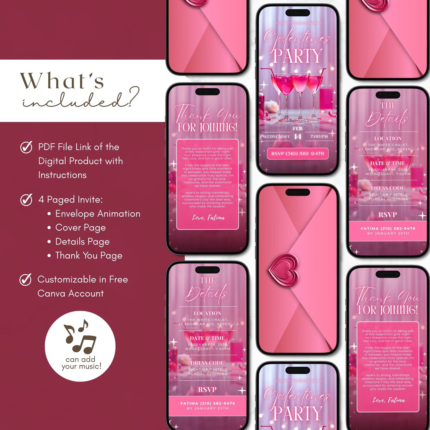 Galentines Party Invite, Valentines Invitation Template for Pink Cocktail Party & Girls Night (Animated Canva Video Template w/ Envelope)
