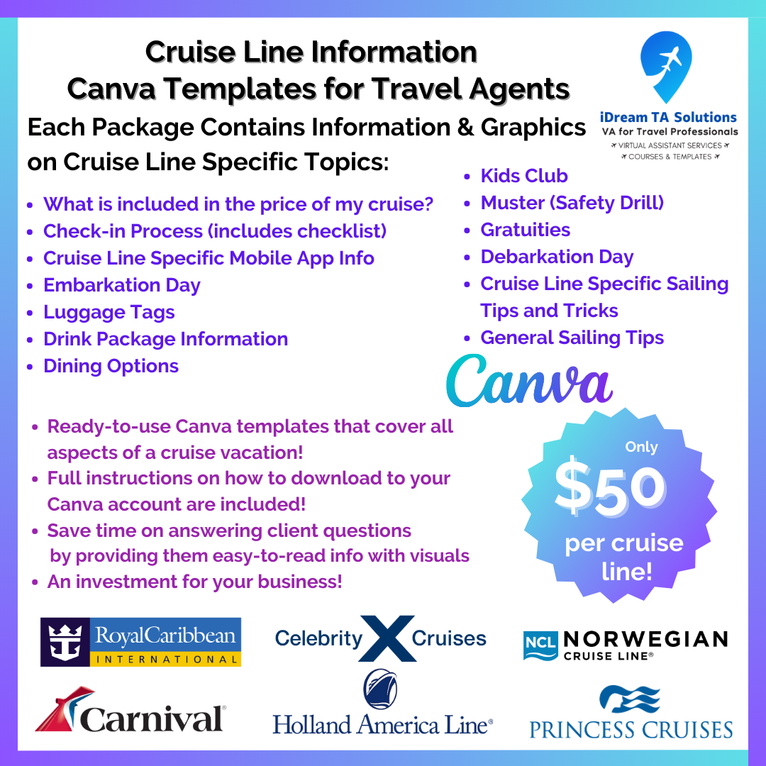 Looking for cruise line info documents but use an email system? Canva PDF templates that you can brand with your logo and upload to your client emails to get them prepared for their cruise!