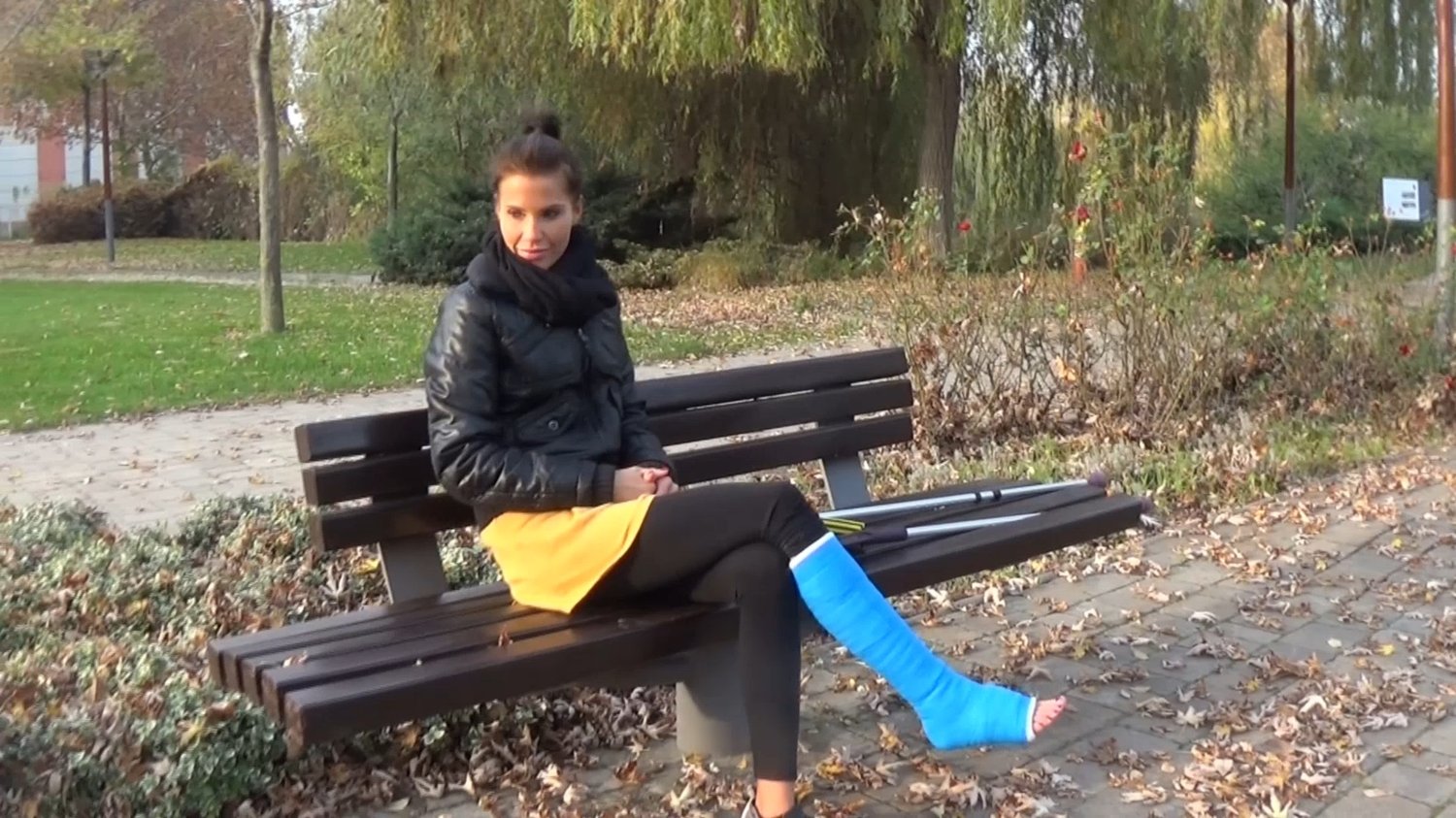 The clip starts with Angela sitting on the bench. You will get a really nice close up of her toes before she crutch further. She is crutching a bit and stops at the bridge and starts wiggles her toes for you. In the rest of the clip she is crutching along the walkway.