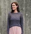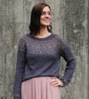This garment is worked top-down, in the round. The yoke combines raglan and circular yoke constructions for shaping. After the neckband, raglan shoulder shaping and short row shaping is incorporated to optimise fit. The majority of the yoke features a stranded colourwork pattern, worked in either two or three colours. Once the yoke is completed, stitches are separated into body and sleeves, which are each worked separately and in the round. After separation, body and sleeves are each worked in stockinette and finished with half-twisted ribbing. Optional colourwork can be added to the sleeves above the cuff.