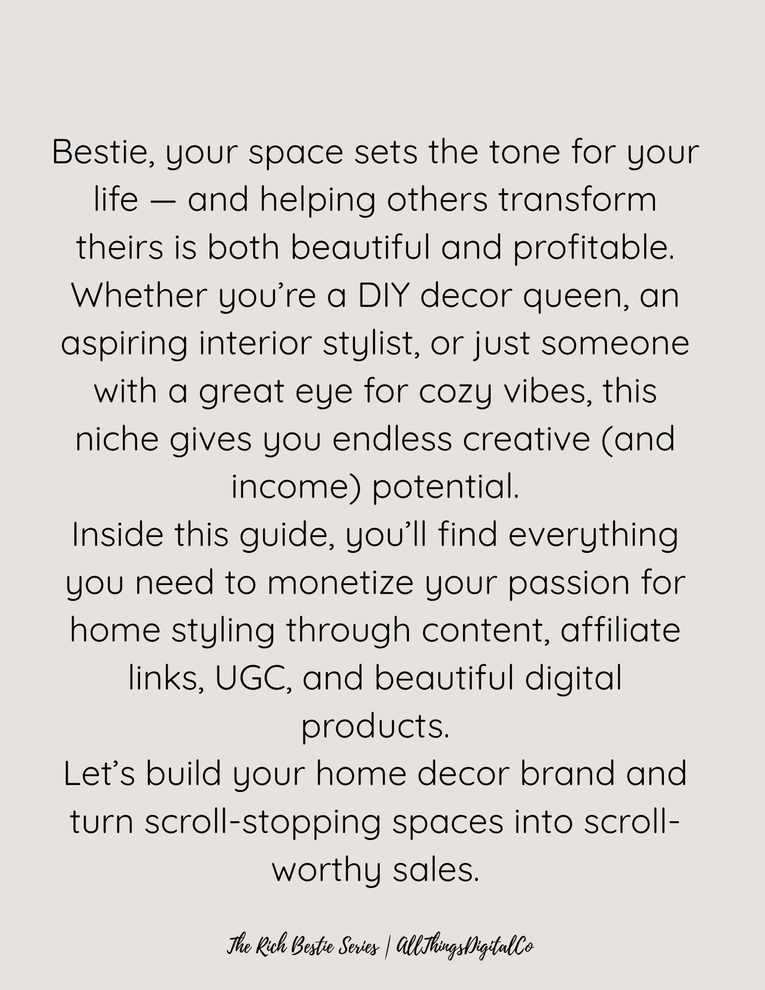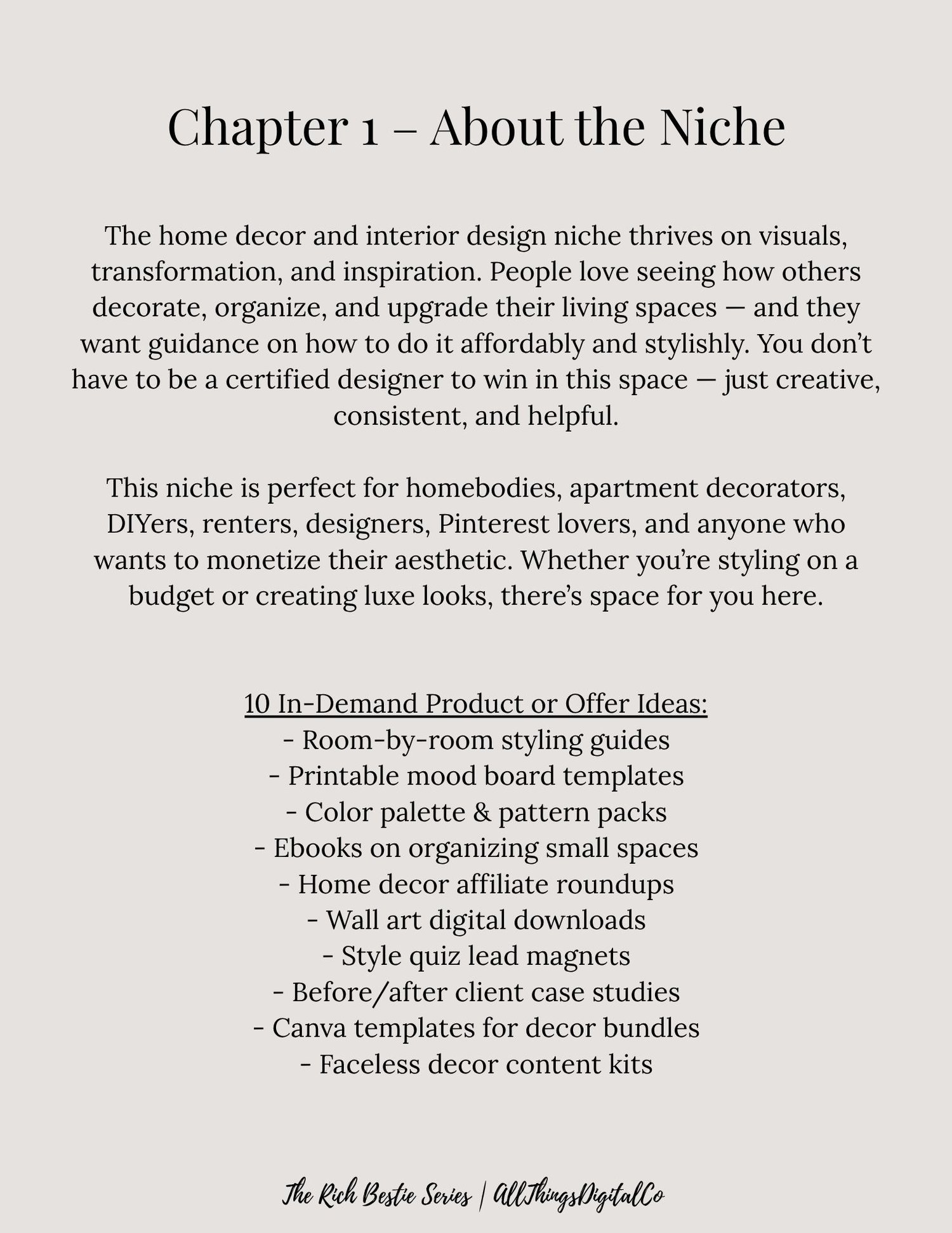 From Pinterest boards to room reveals, the decor niche is full of opportunity. This ebook shows you how to create aesthetic content, offer digital or affiliate products, and show up consistently — even if you never show your face. Build your cozy, luxe, or minimal vibe and watch your brand grow.