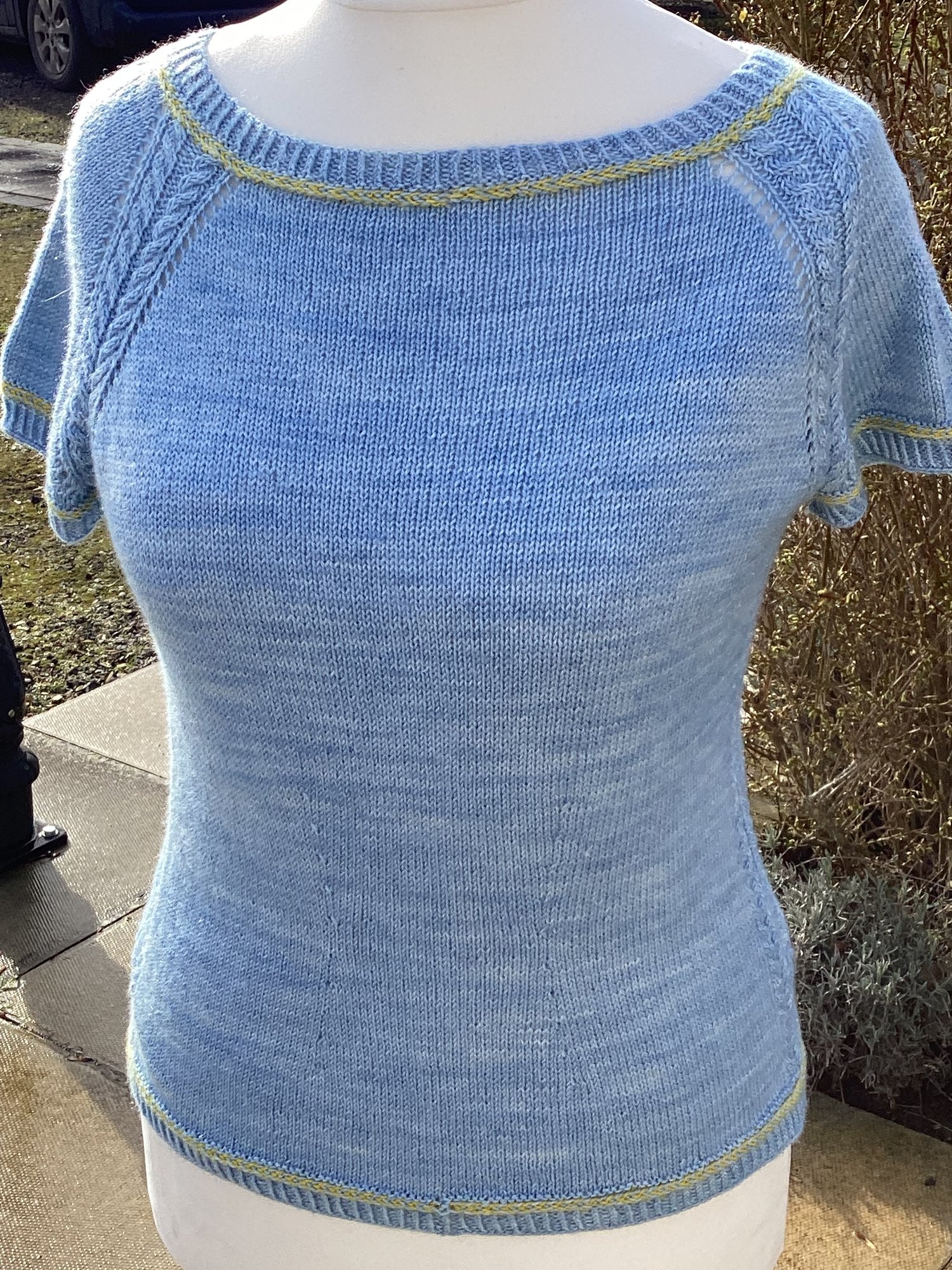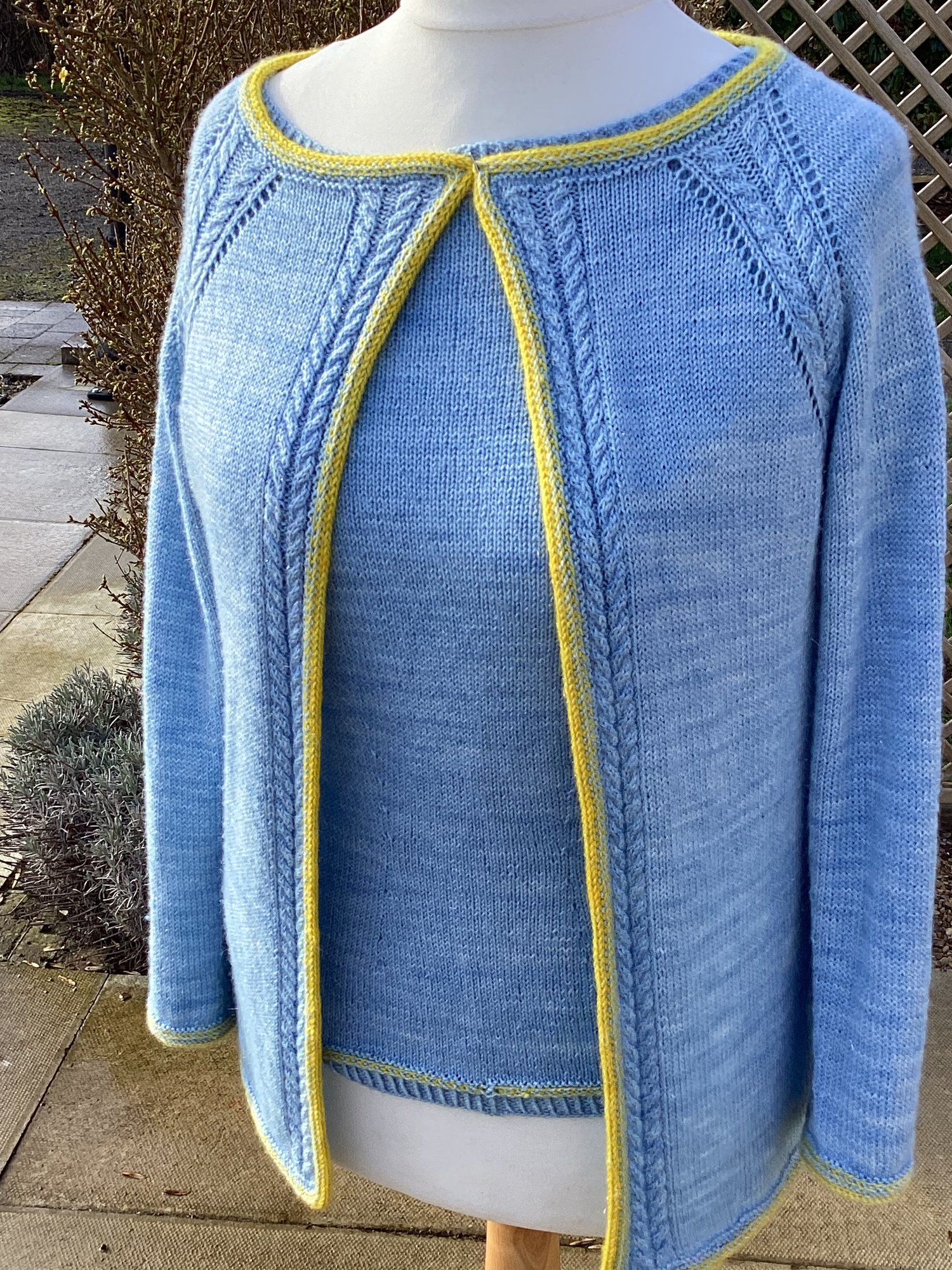 The twinset is knitted in 4ply yarn.