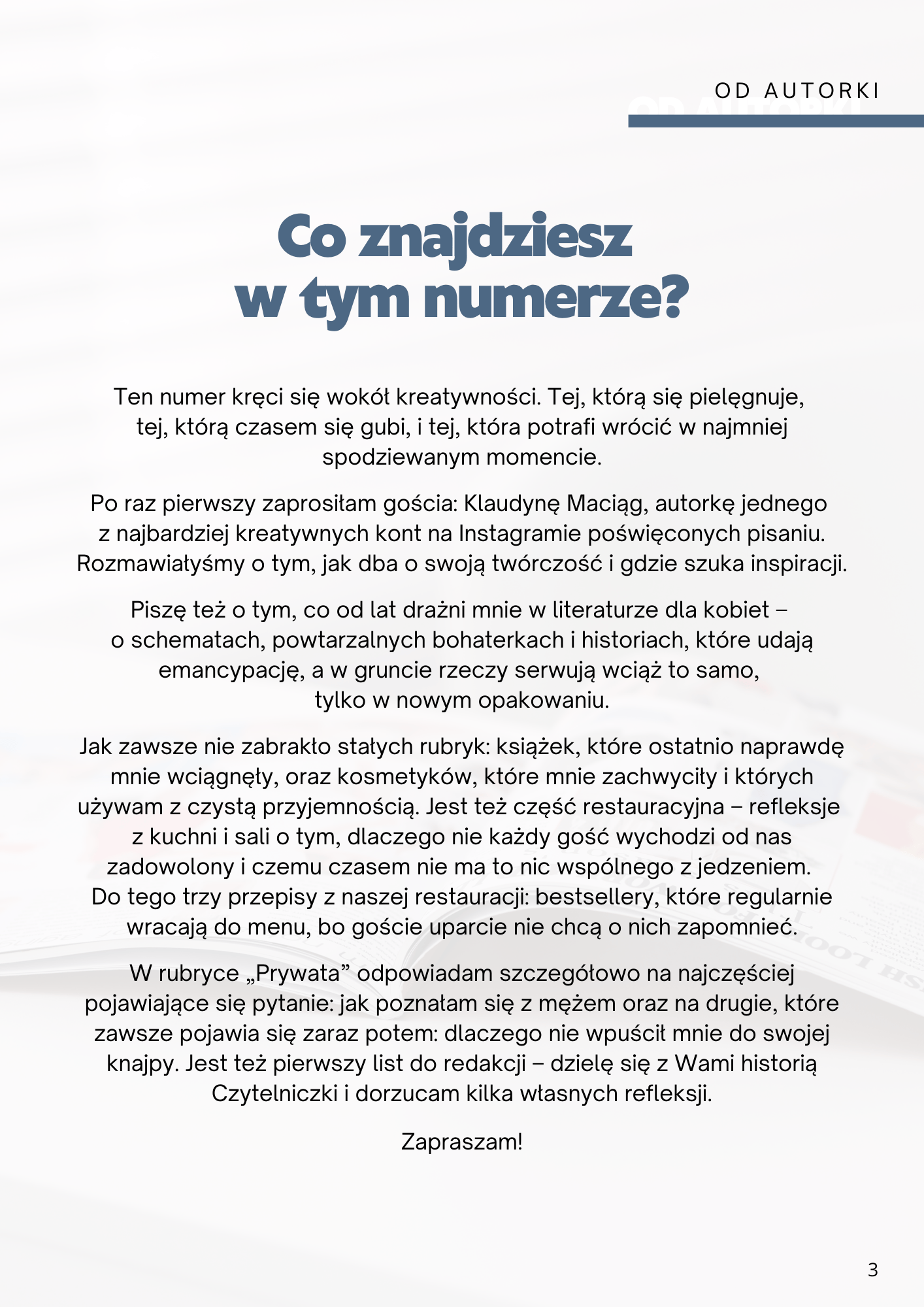Pierwsze wydanie kręci się wokół kreatywności. Piszę o momentach, w których się ją gubi, i o tych, w których niespodziewanie wraca.